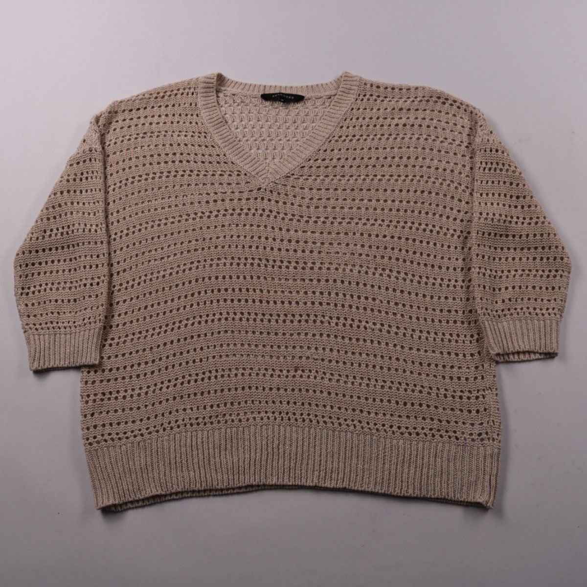 Джемпер Peacocks бежевого цвета с V-образным вырезом и ажурной вязкой с лёгким металлизированным блеском. Подойдёт для повседневных образов в офис или на прогулку в тёплую весну/осень и прохладное лето. Материал лёгкий и хорошо пропускает воздух.