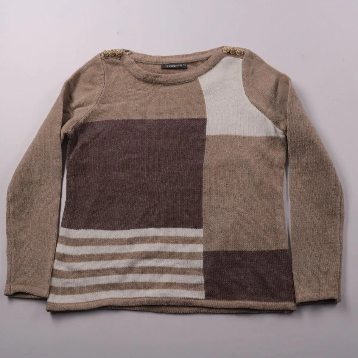 Джемпер Bonmarche размера XS с геометрическим колор-блоком в бежево-коричневых и белых тонах и декоративными пуговицами на плечах. Подойдёт для повседневной носки в прохладную погоду, хорошо сочетается с джинсами и брюками. Практичное преимущество — лёгкий в уходе акриловый трикотаж.