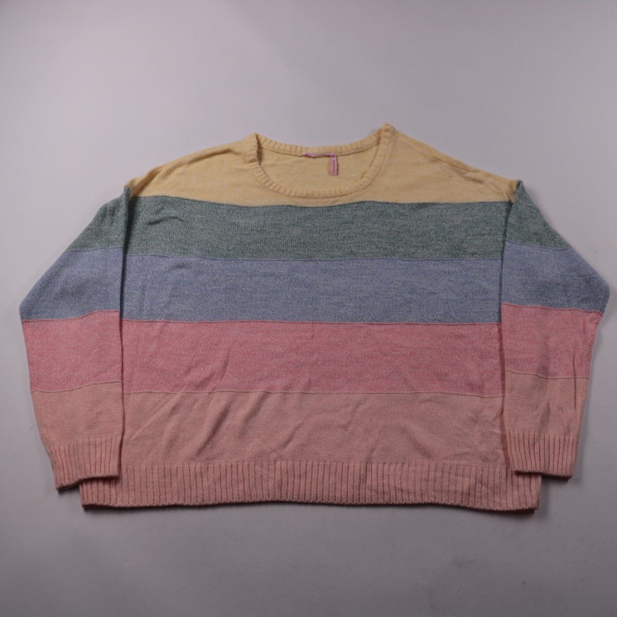Полосатый вязаный свитер с круглым вырезом, бренд не указан. Подойдёт для повседневной носки в прохладную погоду и для многослойных образов. Акриловый состав легко стирается и быстро сохнет.