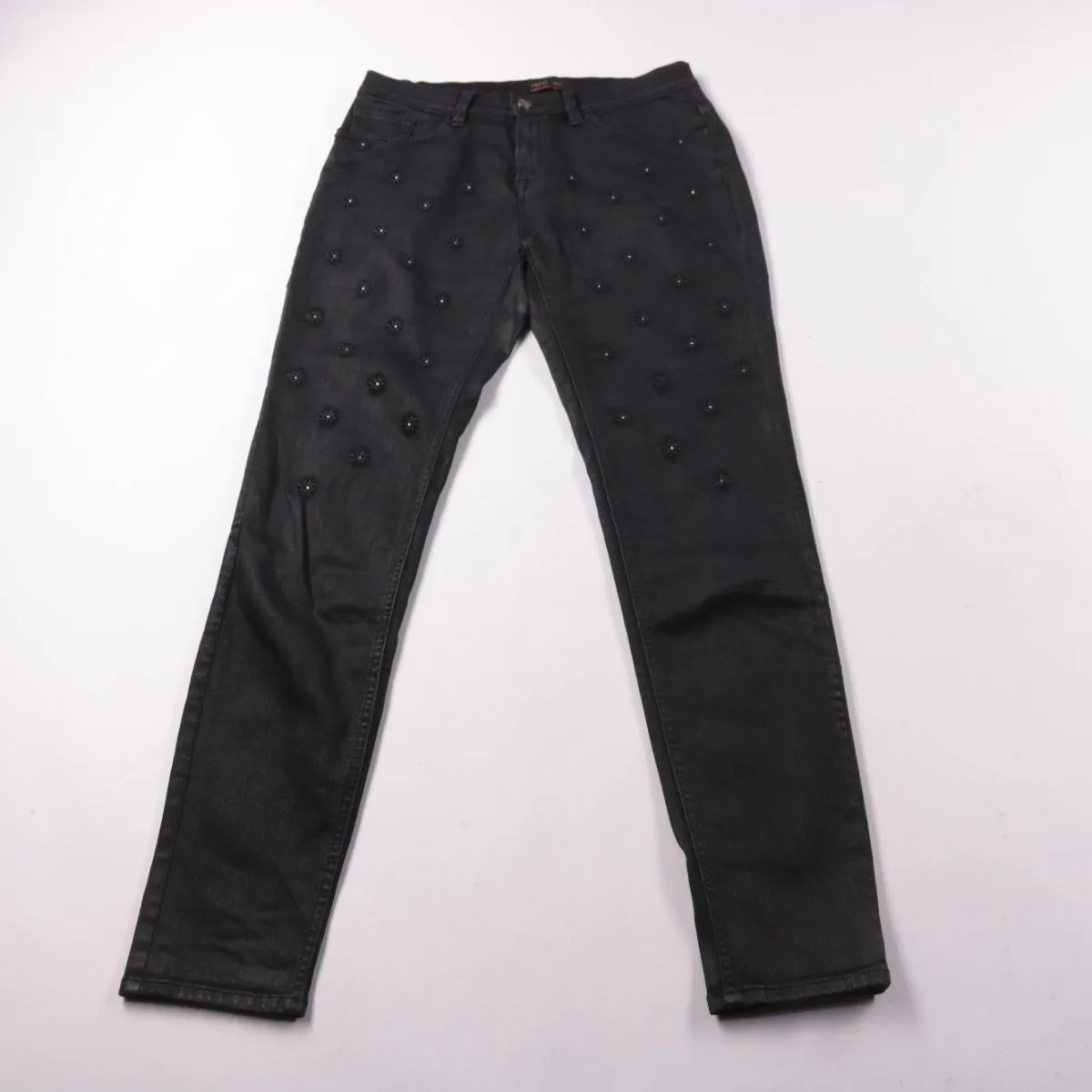 Чёрные женские джинсы с декоративными заклёпками/бусинами спереди. Подойдут для повседневных образов и вечерних выходов с обувью на каблуке или кедами. Практичный плюс — плотный деним хорошо держит форму.