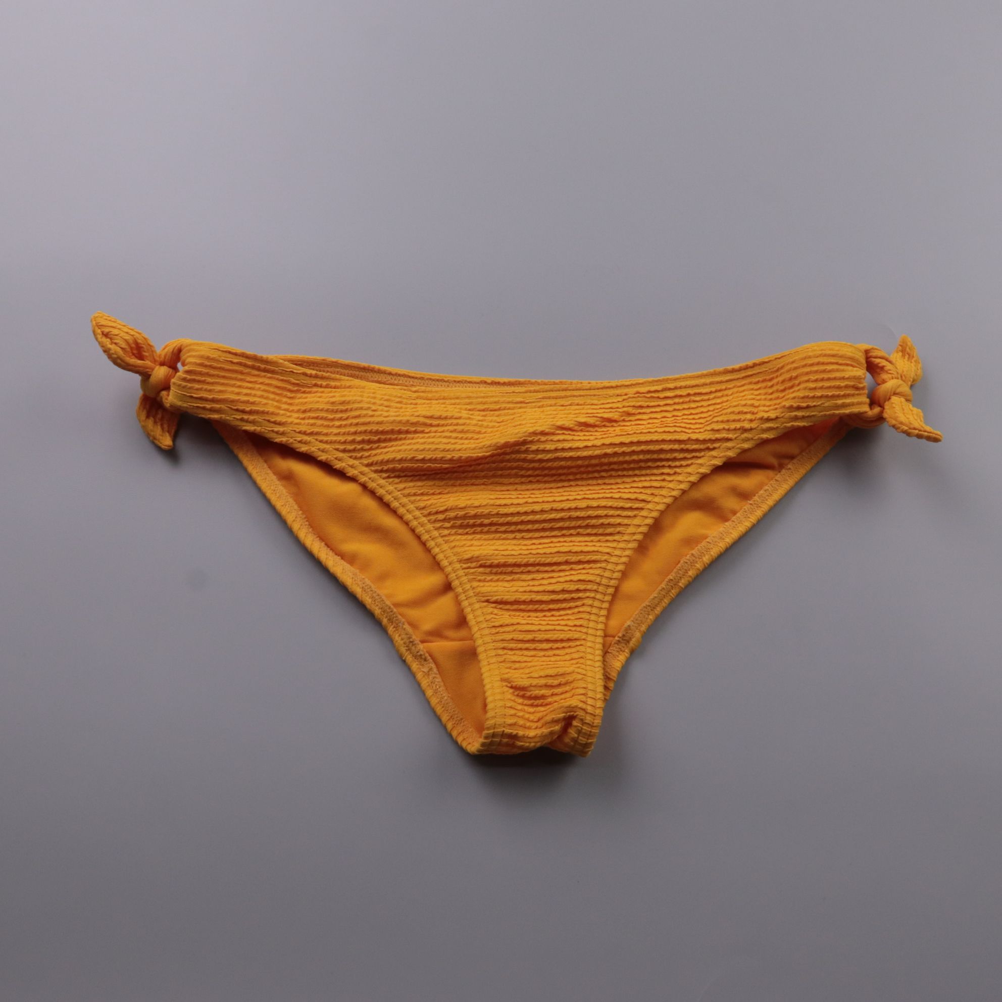 Низ от купальника Matalan горчичного цвета с фактурной тканью и завязками по бокам. Подойдёт для пляжа и бассейна, легко сочетается с однотонным верхом. Эластичный материал хорошо садится по фигуре и быстро сохнет.