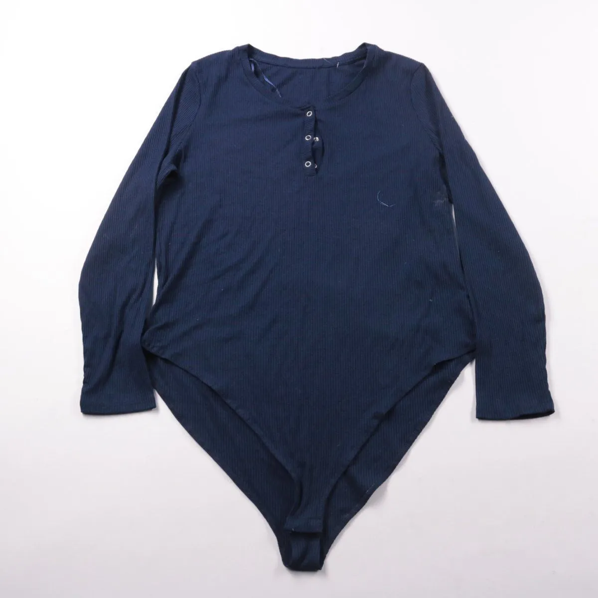 Женское боди Primark тёмно-синего цвета из фактурного трикотажа в рубчик, с длинным рукавом и планкой на пуговицах. Подойдёт для повседневных образов как базовый верх под джинсы или юбку. Хорошо фиксируется и не задирается благодаря форме боди.