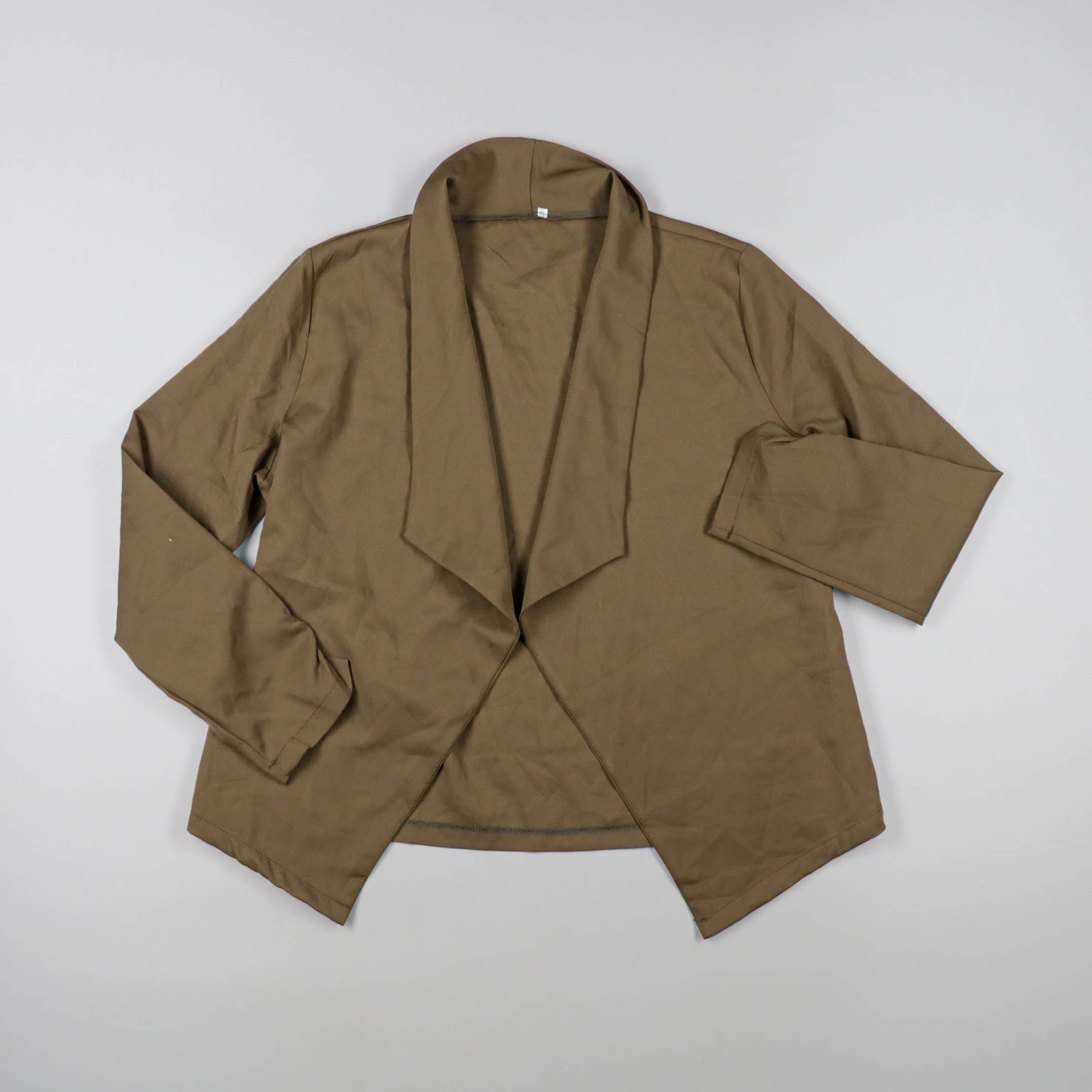 Женский пиджак без бренда в коричневом цвете, с открытым запахом и мягкими лацканами. Подойдёт для офиса и повседневных образов, хорошо сочетается с джинсами и платьями. Лёгкий и не сковывает движения, удобно носить как второй слой.
