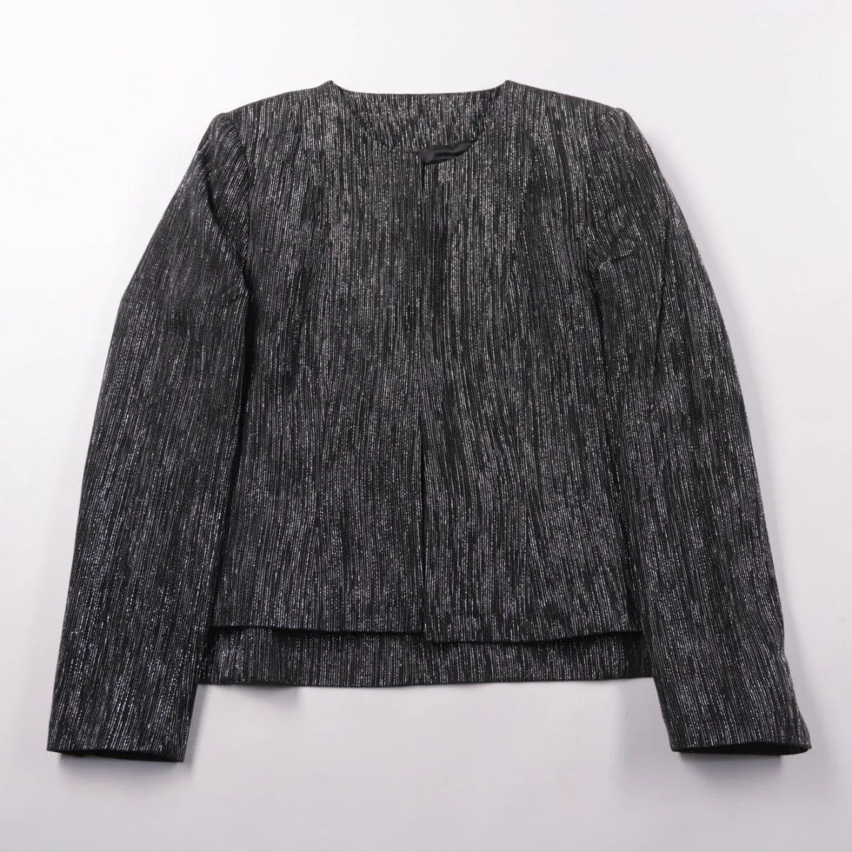 Женский укороченный пиджак с легким блеском и фактурной тканью. Подойдёт для вечерних выходов и офисных образов с однотонными брюками или юбкой. Практичный плюс — подкладка делает посадку комфортнее и помогает держать форму.
