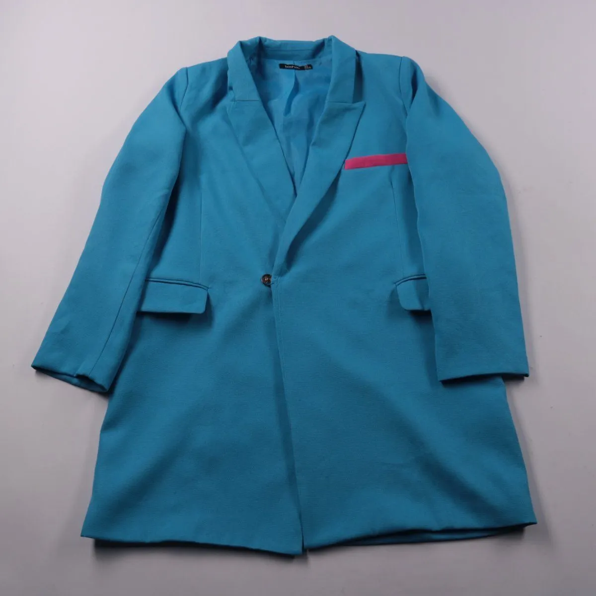 Удлинённый пиджак Boohoo яркого голубого цвета с лацканами и застёжкой на одну пуговицу, с розовой окантовкой кармана. Подойдёт для повседневных образов, офиса или выхода, когда нужен акцентный верх. Практичен тем, что имеет подкладку и хорошо держит форму.