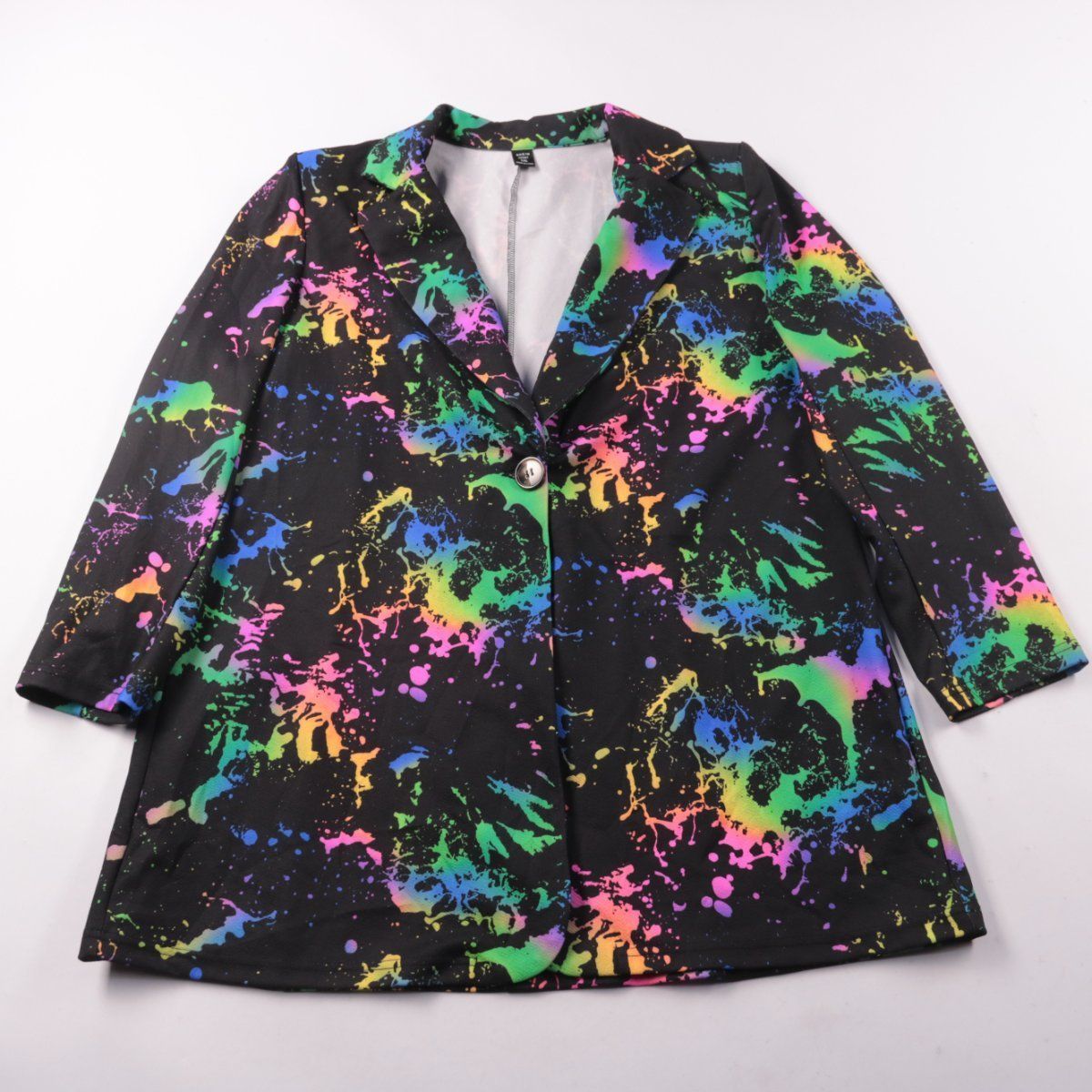 Женский пиджак SHEIN CURVE с ярким разноцветным принтом и застёжкой на одну пуговицу. Подойдёт для повседневных образов и как акцентный слой поверх однотонных вещей. Ткань с добавлением эластана немного тянется и комфортна в носке.