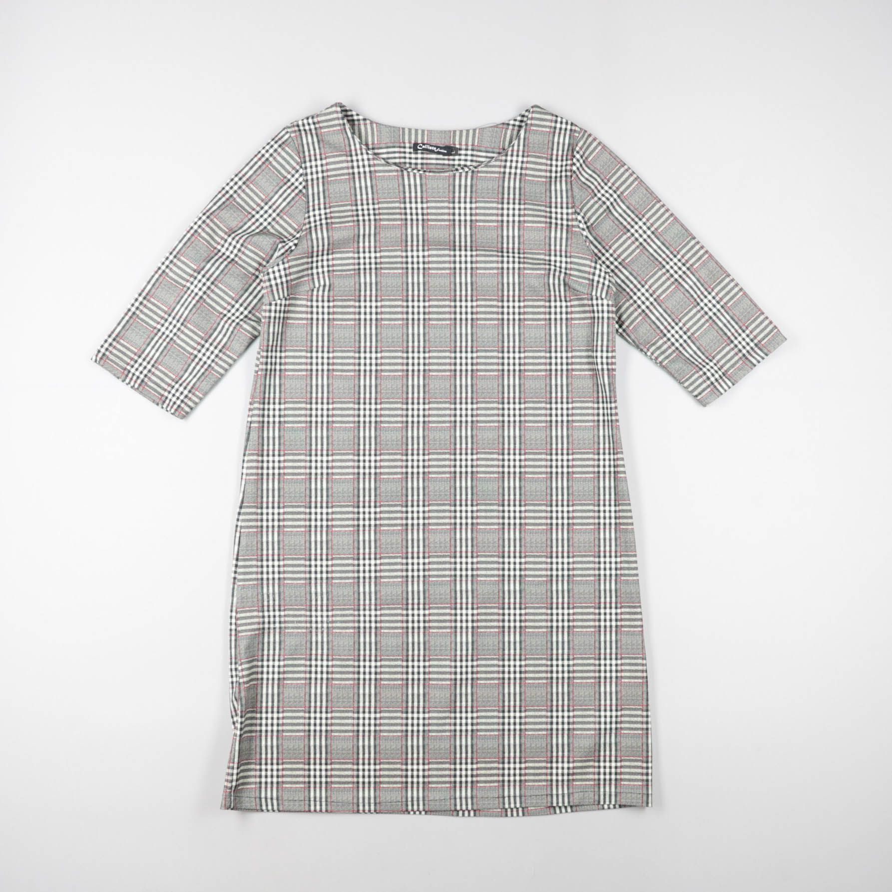 Платье Calliope прямого кроя в серую клетку, длина миди и рукав 3/4. Подойдёт для офиса и повседневных выходов, легко сочетается с жакетом или кардиганом. Практичный плюс — немаркий принт и удобная посадка без лишнего объёма.