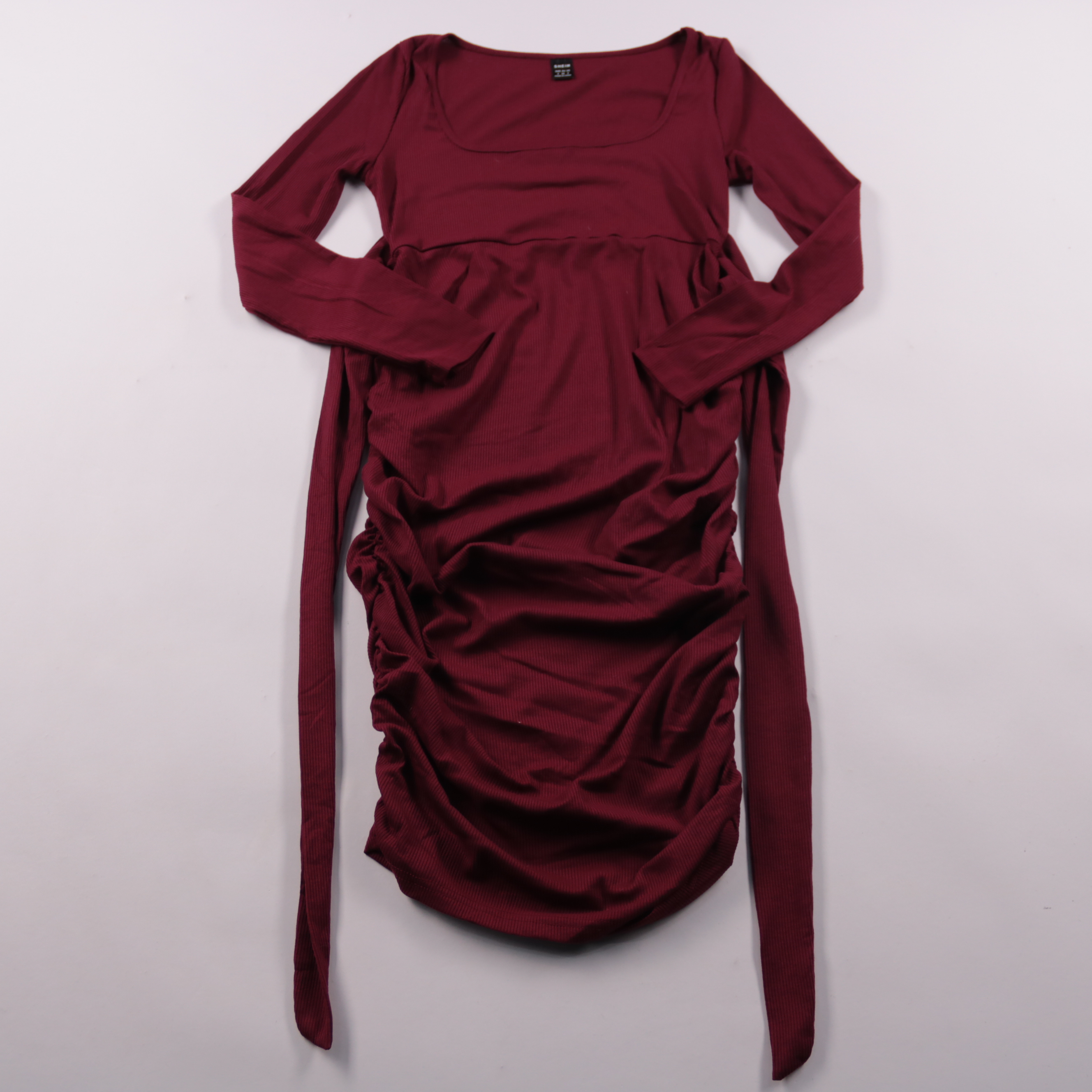 Повседневное трикотажное платье Shein бордового цвета с длинным рукавом и квадратным вырезом. Модель с драпировкой и длинными завязками по бокам — удобно регулировать посадку и длину под настроение. Подойдёт для прогулок и встреч в прохладную погоду, т...