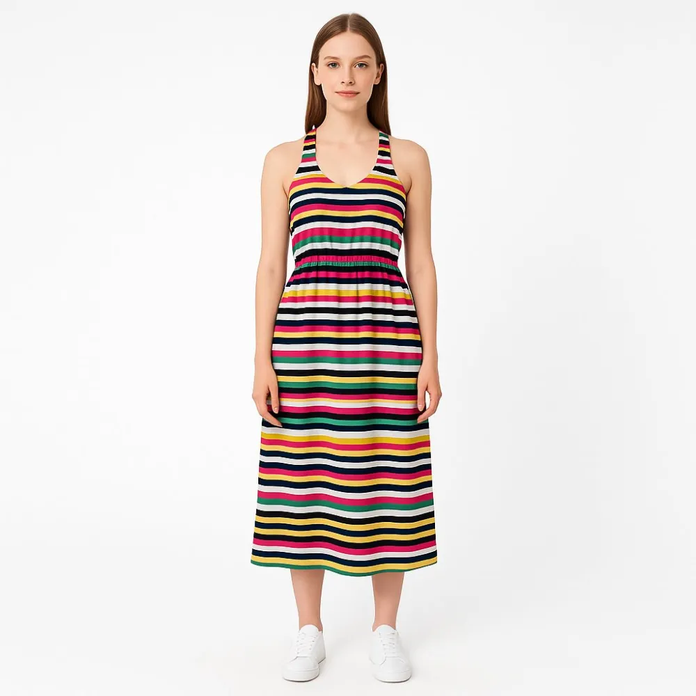 Повседневное платье OVS в яркую разноцветную полоску, длина миди и верх на бретелях. Подойдёт для прогулок, отдыха и поездок в тёплую погоду. Лёгкий полиэстер почти не мнётся и быстро сохнет.