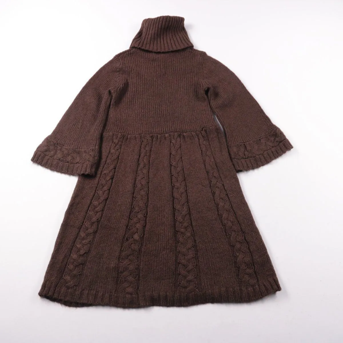 Вязаное платье Mango коричневого цвета с высоким воротником и фактурными косами по юбке и рукавам. Подойдёт для зимних и холодных демисезонных дней в повседневных образах с ботинками или сапогами. Плотная вязка хорошо сохраняет тепло и комфортна в носке.
