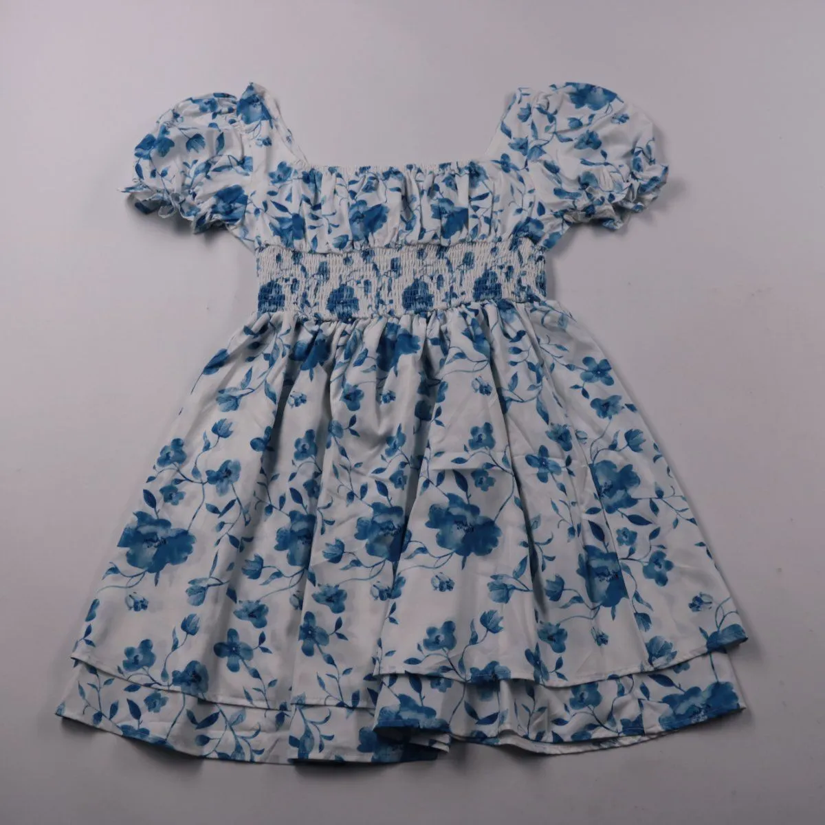 Женское повседневное платье SHEIN с бело-синим цветочным принтом, пышными рукавами и эластичной сборкой (смокинг) на лифе. Подойдёт для летних прогулок и отдыха, хорошо держится по фигуре за счёт тянущейся талии. Лёгкая синтетическая ткань быстро сохнет и почти не мнётся.