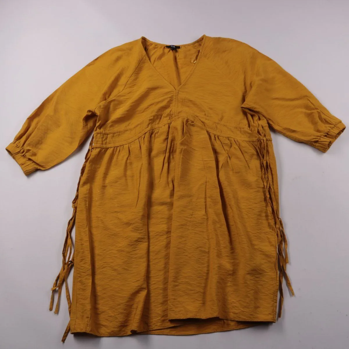 Повседневное платье C&A горчичного оттенка с V-образным вырезом и свободной посадкой. Подойдёт для прогулок и повседневных образов в тёплый сезон и в демисезон с жакетом/кардиганом. Лёгкая ткань с вискозой и кулиски по бокам делают посадку более удобной.