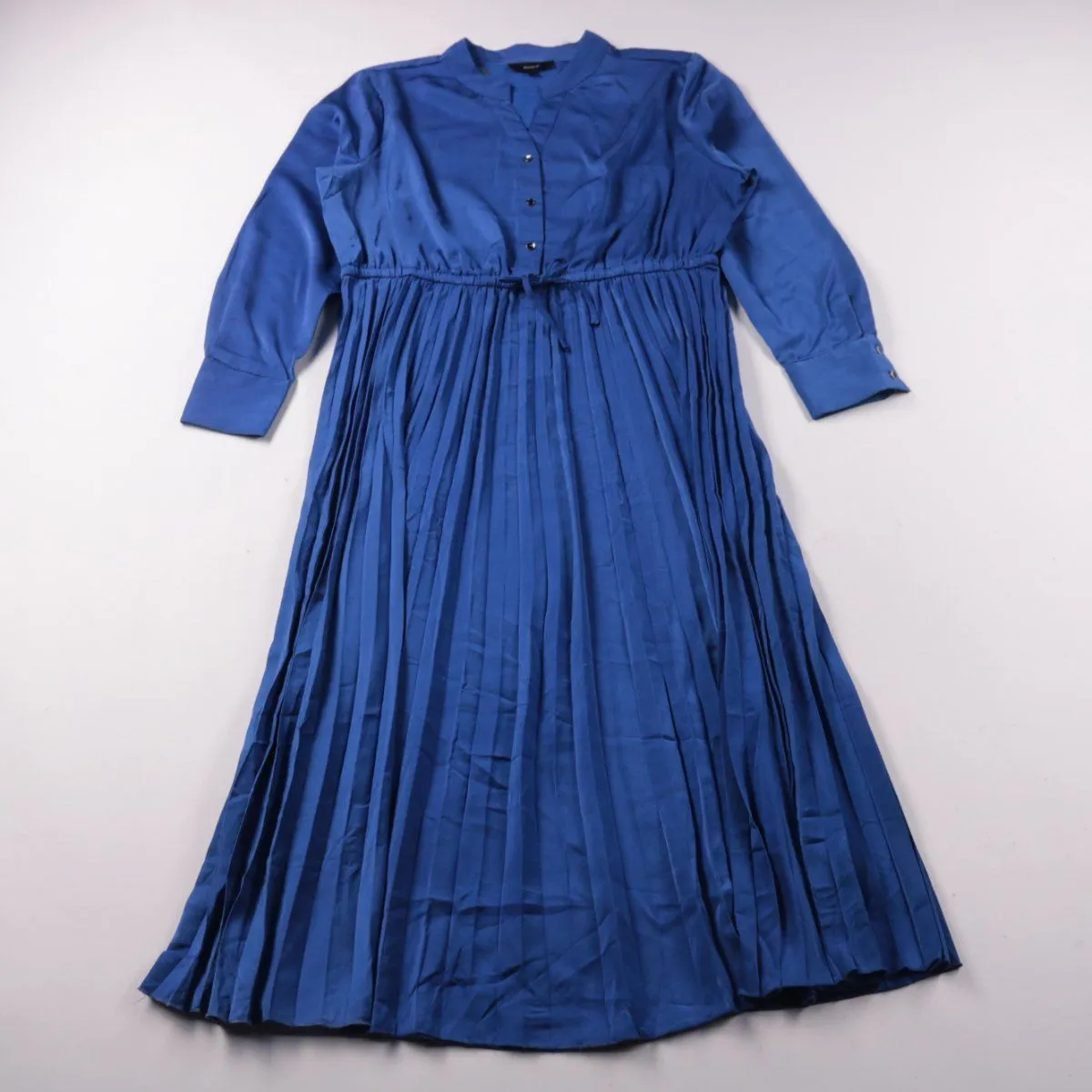 Повседневное платье Basque насыщенного синего цвета с длинным рукавом, планкой на пуговицах и поясом на кулиске. Подойдёт для офиса и прогулок в прохладную погоду, плиссированная юбка красиво держит форму. Практичный плюс — ткань из полиэстера почти не мнётся и проста в уходе.