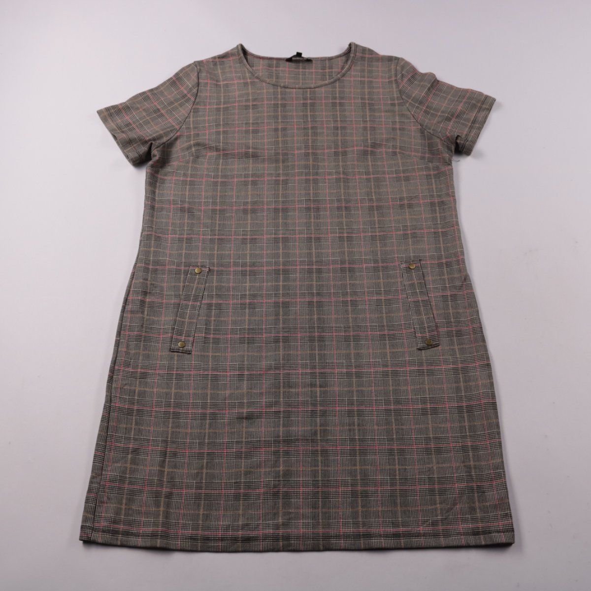 Повседневное платье Peacocks прямого кроя в серую клетку, с коротким рукавом и круглым вырезом. Подойдёт для офиса и на каждый день, легко сочетается с жакетом или кардиганом. Есть накладные карманы, а ткань с эластаном немного тянется.