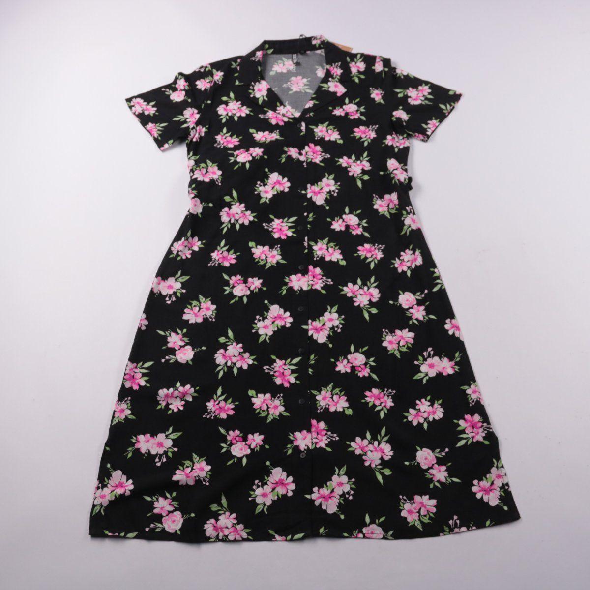 Повседневное платье Pieces чёрного цвета с розовым цветочным принтом, короткими рукавами и застёжкой на пуговицы спереди. Подойдёт для прогулок и офиса в тёплую погоду, а пояс помогает подчеркнуть талию и регулировать посадку.