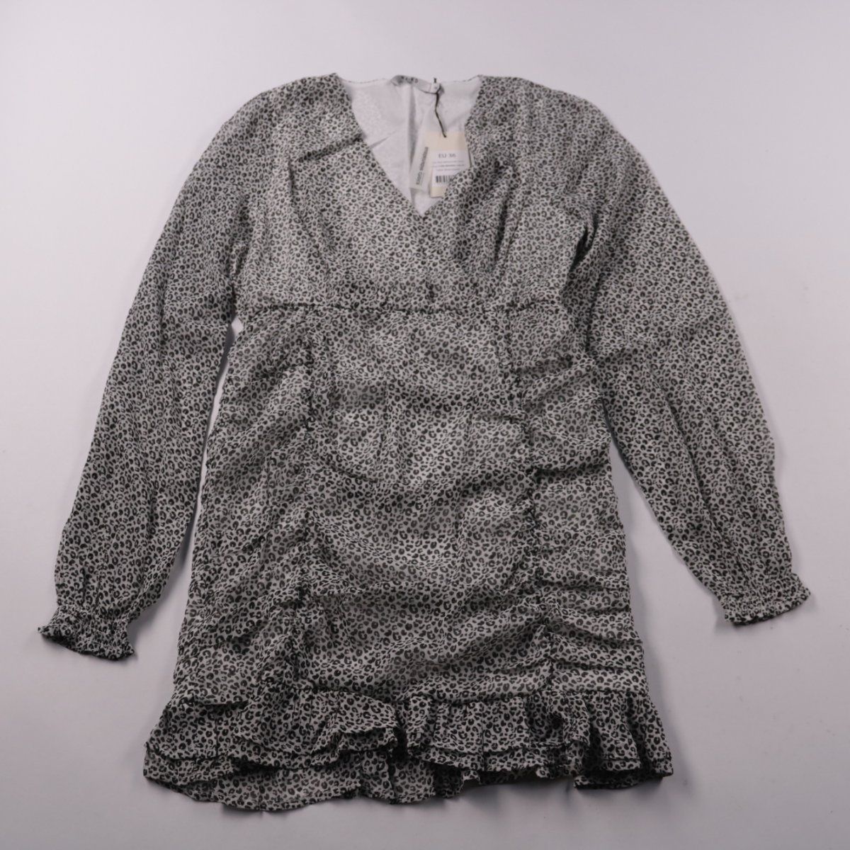 Женское платье NA-KD с леопардовым принтом, V-образным вырезом и длинными рукавами. Модель с драпировкой по бокам и оборкой по низу подойдёт для повседневных образов и выхода вечером. Плотная посадка подчёркивает силуэт и не требует сложных сочетаний в образе.