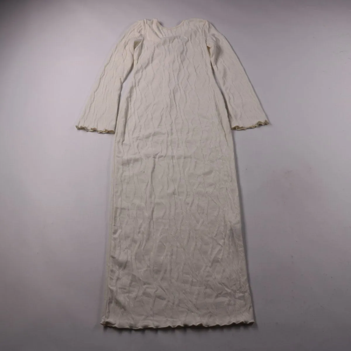 Повседневное платье SHEIN молочного цвета с длинными рукавами и фактурной тканью. Подойдёт для повседневных образов в прохладную погоду, хорошо сочетается с жакетом или кардиганом. Практичный плюс — синтетический материал менее требователен в уходе и быстрее сохнет.
