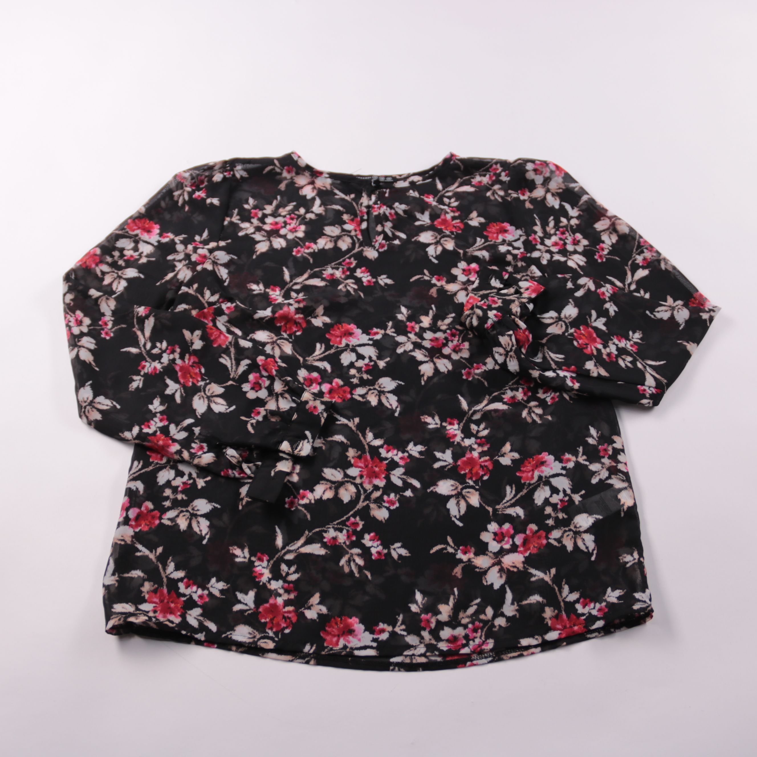 Женская блузка Atmosphere с цветочным принтом на чёрном фоне и длинным рукавом. Подойдёт для повседневных образов и офиса в сочетании с джинсами или юбкой. Лёгкая ткань из полиэстера почти не мнётся и проста в уходе.