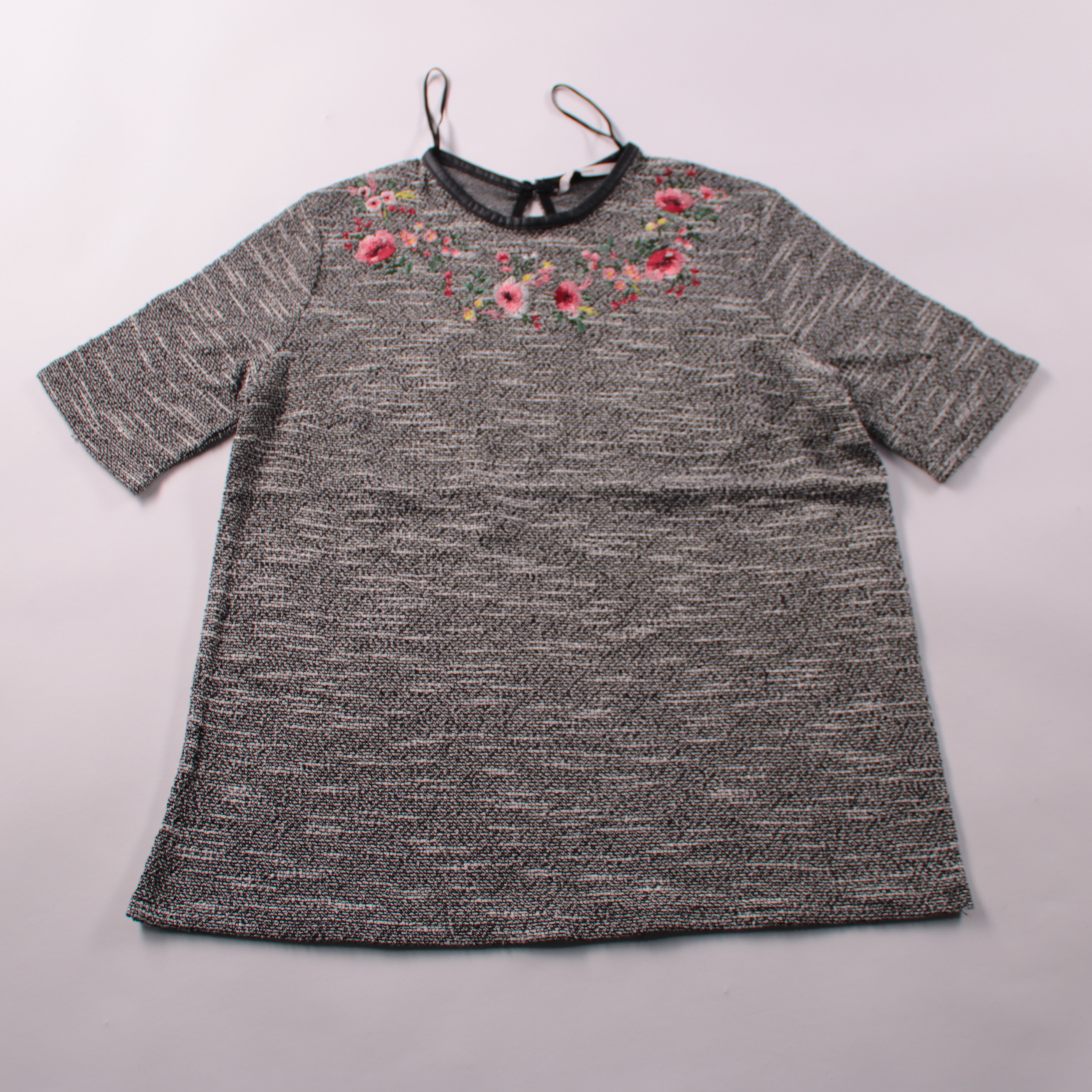 Блузка Tu Woman из фактурного серого трикотажа с цветочной вышивкой на груди и коротким рукавом. Подойдёт для повседневных образов в офис или на прогулку, хорошо сочетается с джинсами и юбками. Мягкая ткань комфортно носится и почти не мнётся.