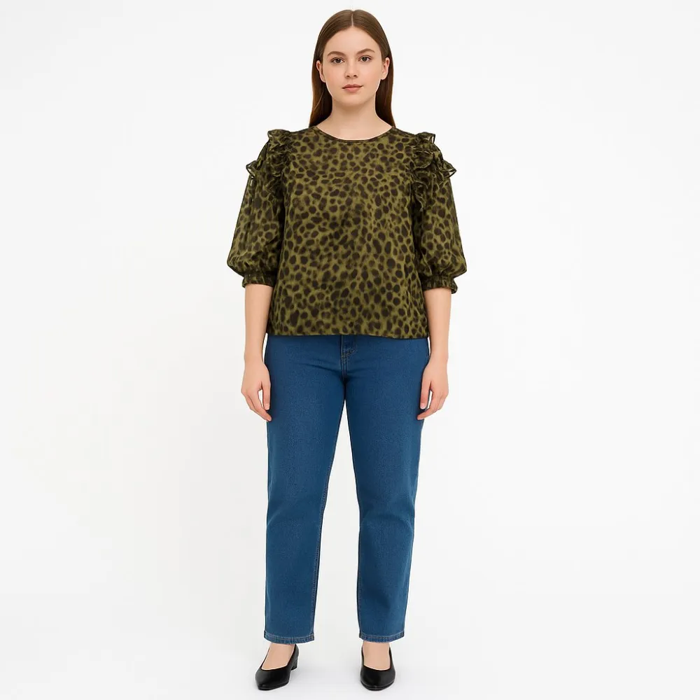 Женская блузка H&M с леопардовым принтом в зелёно-чёрной гамме и объёмными рукавами 3/4 с рюшами на плечах. Подойдёт для повседневных образов с джинсами или брюками в офис с нестрогим дресс-кодом. Лёгкая ткань не мнётся и быстро сохнет после стирки.