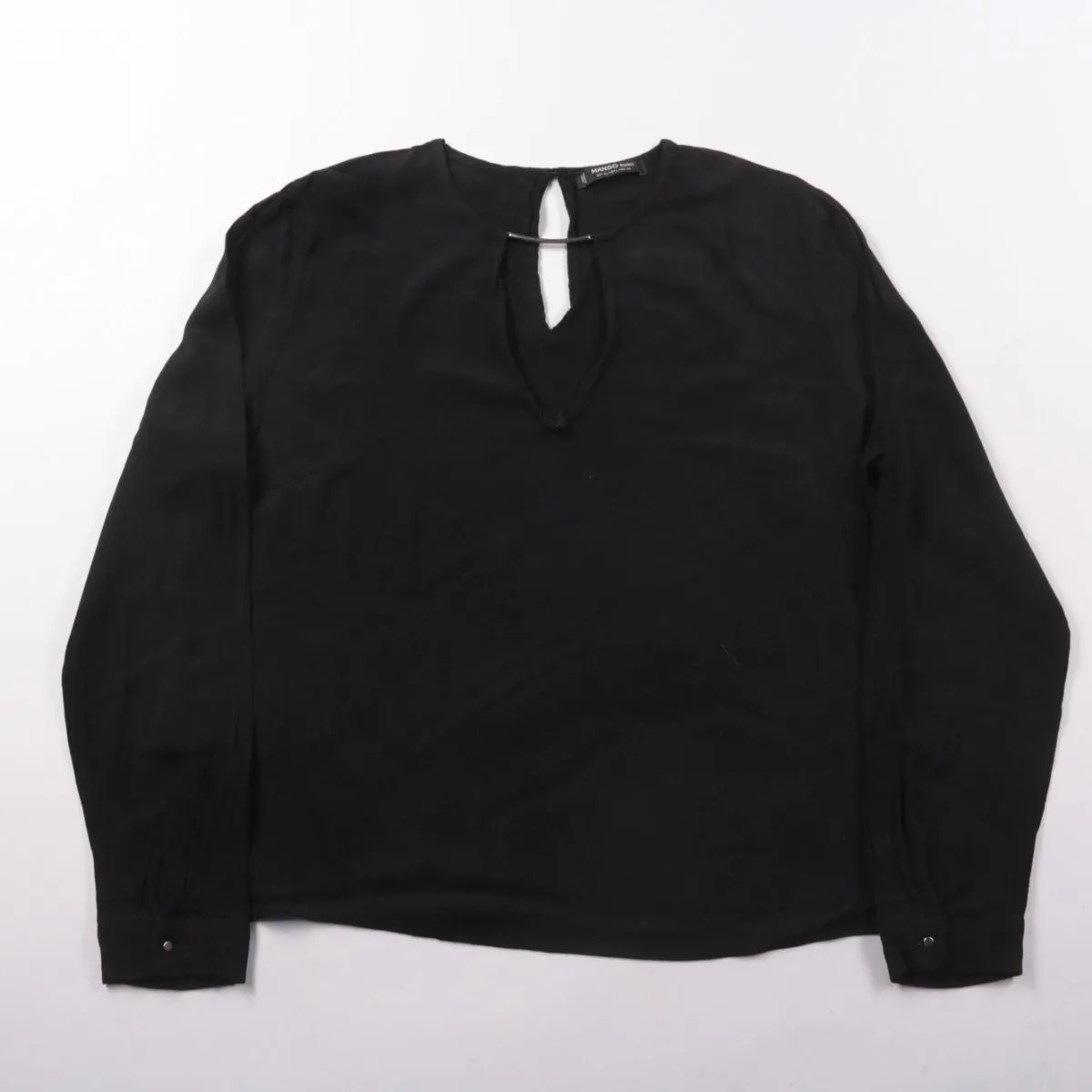 Женская блузка Mango Basics чёрного цвета с длинным рукавом и V-образным вырезом с декоративной перемычкой. Подойдёт для офиса и на каждый день, легко сочетается с брюками или юбкой. Мягкая вискоза приятна к телу и хорошо драпируется.