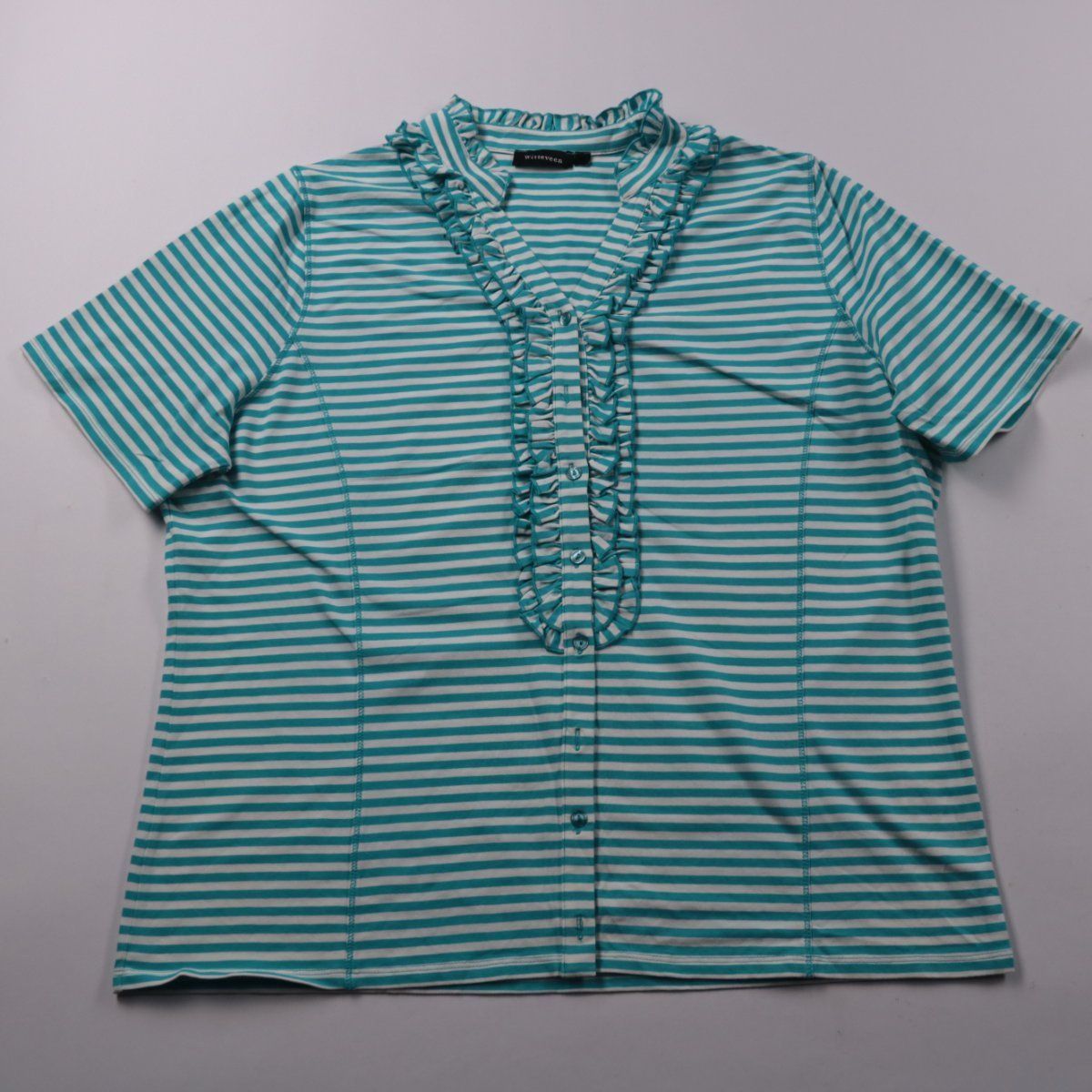 Женская блузка Witteveen в бирюзово-белую полоску с коротким рукавом и V-вырезом, украшенным рюшами. Подойдёт для повседневных комплектов и офиса в тёплое время или под кардиган в прохладу. Ткань с добавлением спандекса слегка тянется и комфортно садится по фигуре.