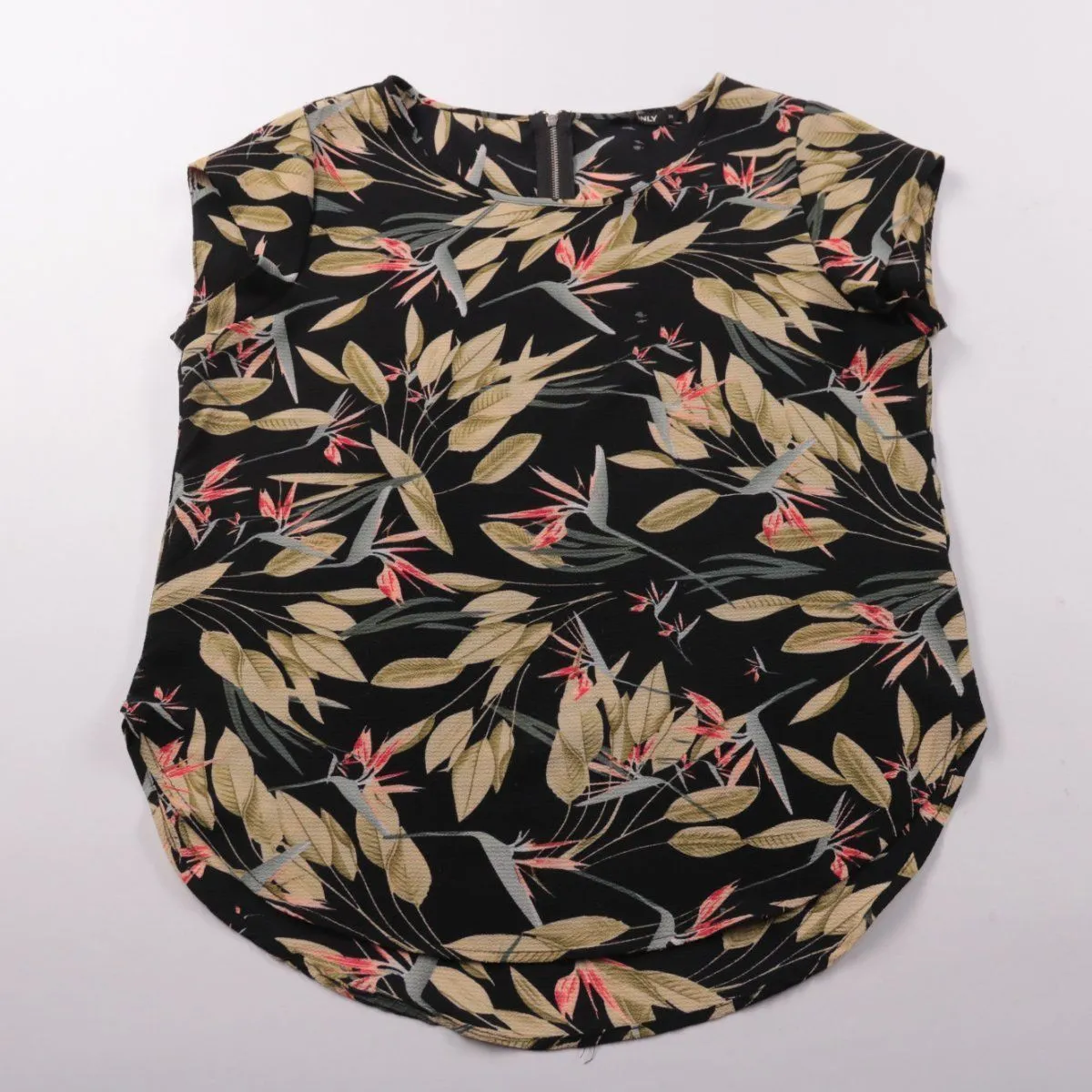 Женская блузка Only с тропическим принтом на чёрном фоне и округлым низом. Подойдёт для лета и тёплой весны, хорошо смотрится с джинсами или однотонной юбкой. Практичный плюс — лёгкая ткань и лаконичный крой, который удобно носить каждый день.