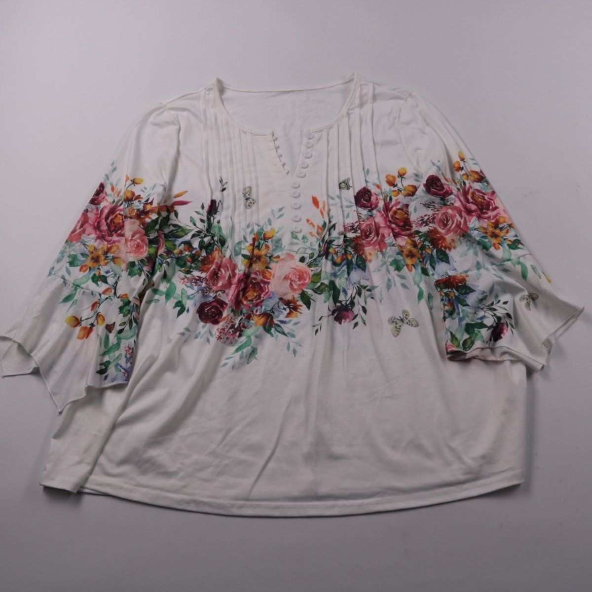 Женская блузка с цветочным принтом и декоративной планкой на пуговицах. Подойдёт для повседневных образов в любое время года, хорошо сочетается с джинсами и юбками. Ткань тянется за счёт эластана и комфортна в носке.