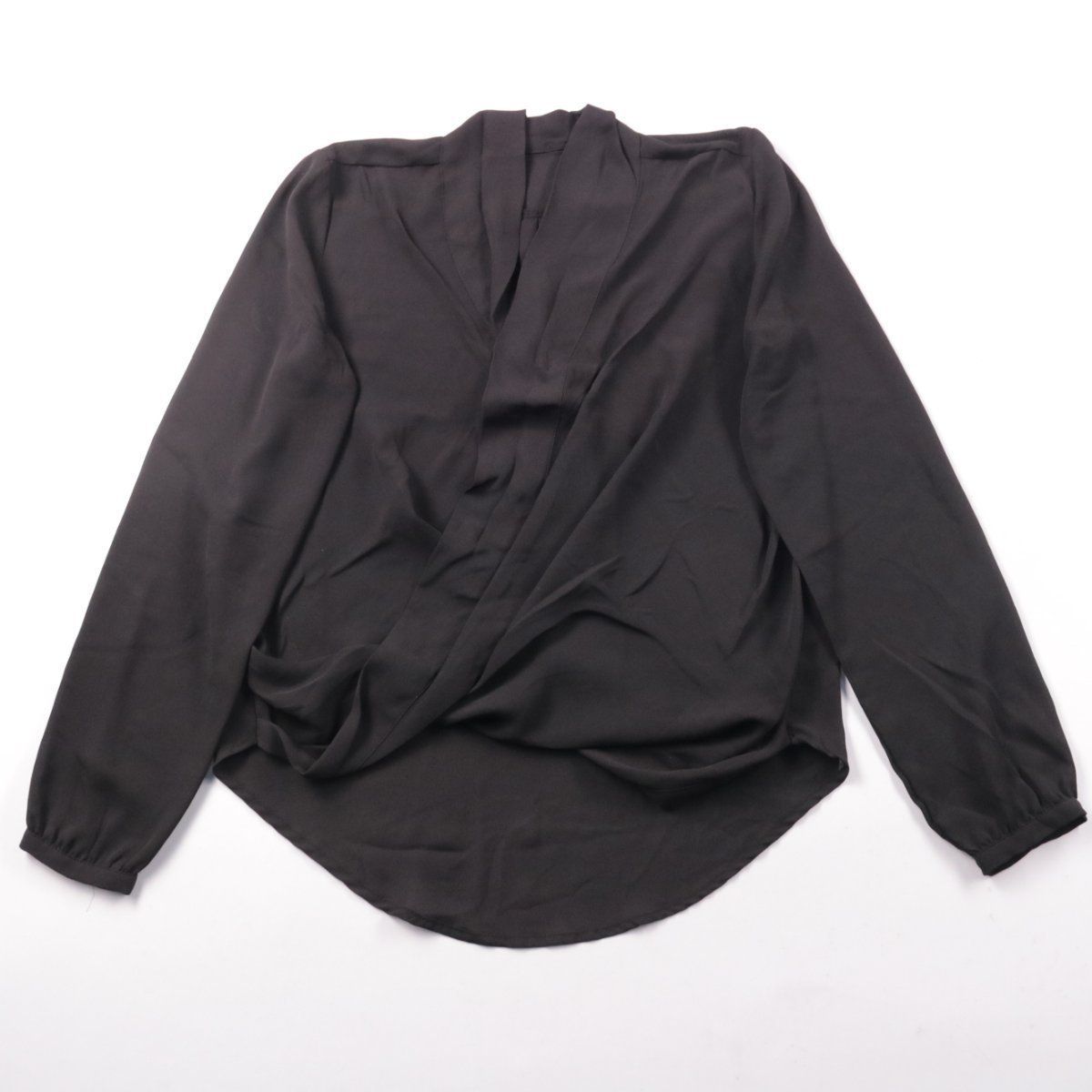Блузка Atmosphere чёрного цвета с запахом и V-образным вырезом, длинный рукав на манжете. Подойдёт для офиса и вечерних образов, легко сочетается с брюками и юбками. Практичный плюс — ткань из полиэстера проста в уходе и почти не мнётся при носке.