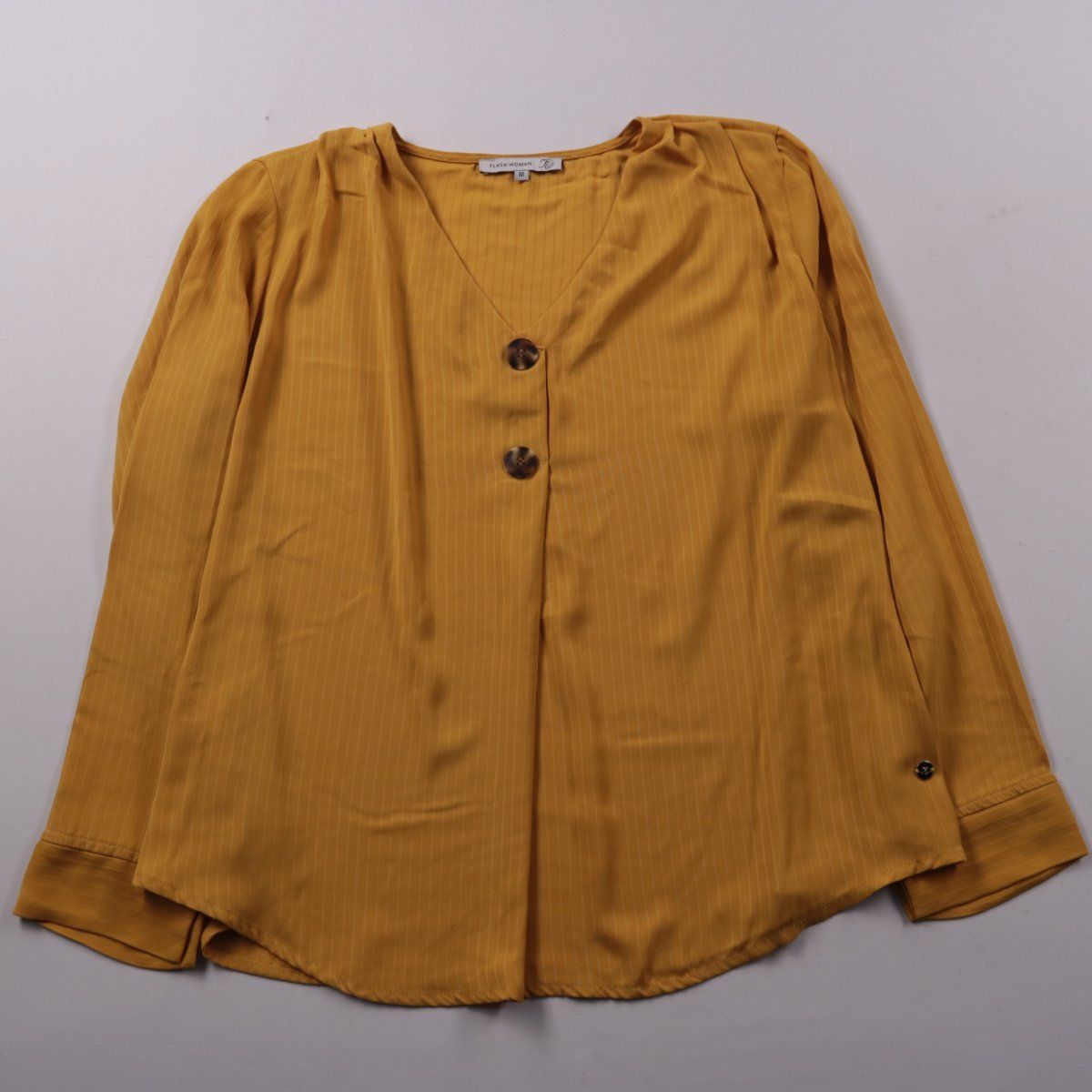 Блузка Flash Woman горчично-жёлтого цвета с V-образным вырезом и застёжкой на пуговицы. Подойдёт для офиса и повседневных образов в тёплое время года или как слой под жакет. Полиэстеровая ткань лёгкая и практичная в уходе, быстро сохнет.
