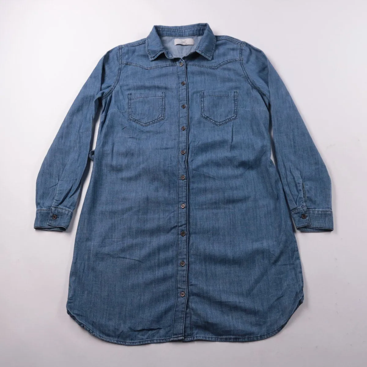 Джинсовое платье-рубашка New Look с длинным рукавом и застёжкой на пуговицы, с поясом и нагрудными карманами. Подойдёт для повседневных образов в городе и на прогулки в демисезон. Плотный деним хорошо держит форму и легко сочетается с кедами или ботинками.