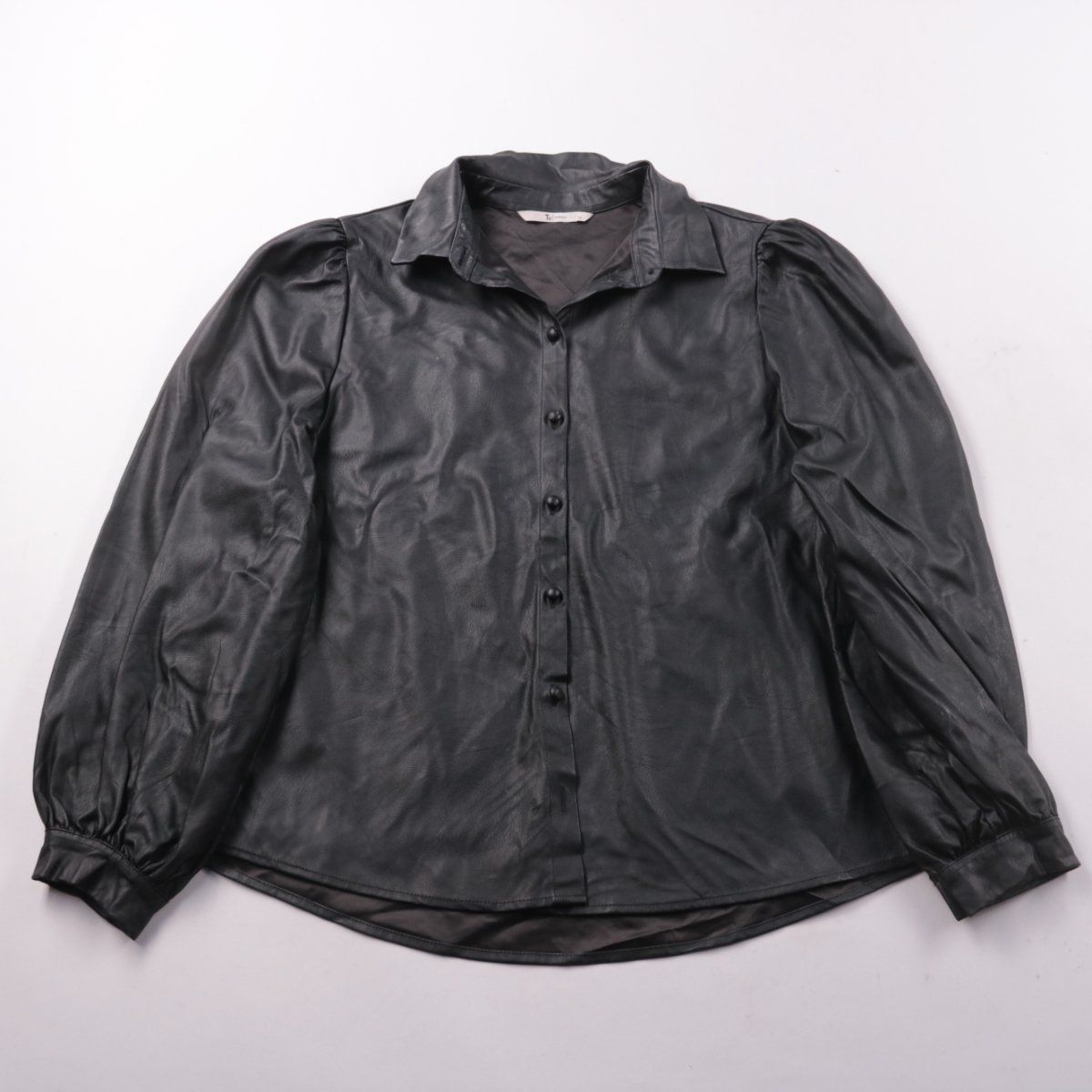 Женская рубашка Tu из материала под кожу, чёрного цвета, с застёжкой на пуговицы и объёмными рукавами. Подойдёт для повседневных и вечерних образов в межсезонье и прохладные дни. Практичное преимущество — легко сочетать с джинсами и юбками, материал выглядит эффектно и не требует сложного ухода.