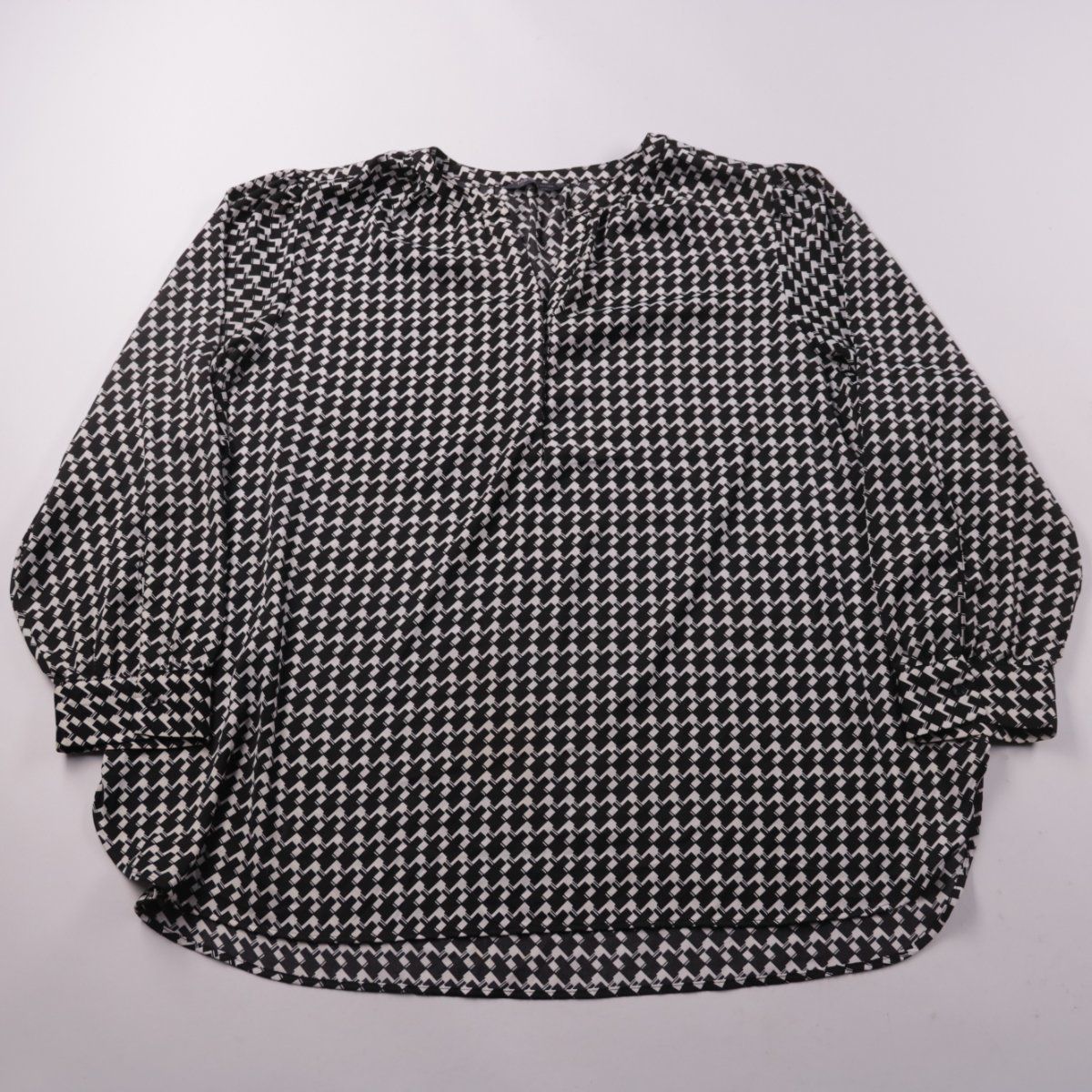 Женская блузка M&S с графичным чёрно-белым принтом и разрезом у горловины. Подойдёт для повседневных образов и офиса в сочетании с брюками или юбкой. Практичный материал почти не мнётся и быстро сохнет.
