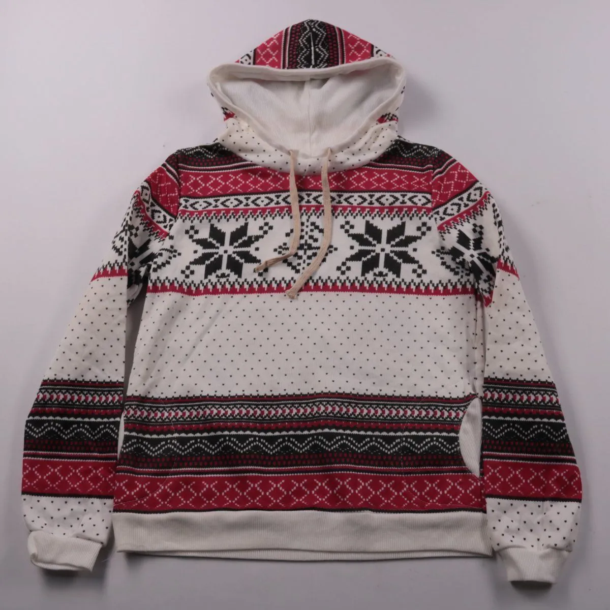 Толстовка Vicabe с капюшоном и скандинавским орнаментом в красно-бело-чёрной гамме. Подойдёт для повседневной носки в прохладную погоду и для прогулок. Мягкая подкладка делает её более тёплой и комфортной.