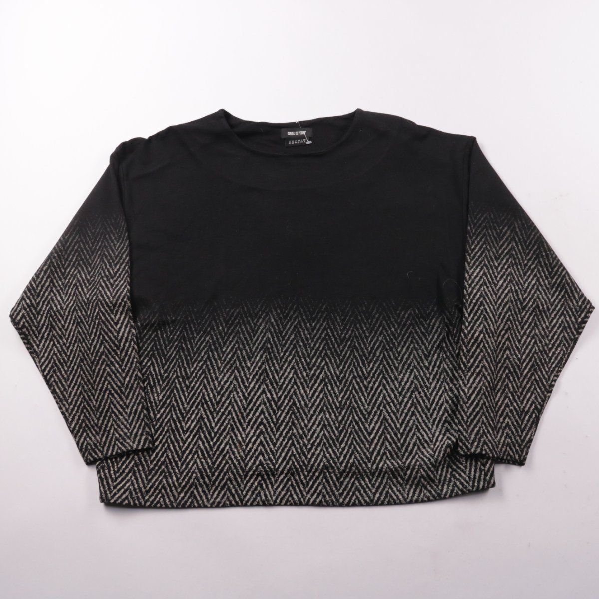 Свитшот Isabel de Pedro с круглым вырезом, чёрный верх и низ с серым узором «ёлочка» на рукавах и по корпусу. Подойдёт для повседневных образов и офиса в стиле casual, хорошо сочетается с джинсами и брюками. Трикотажный состав с эластаном даёт комфортную посадку и немного тянется.