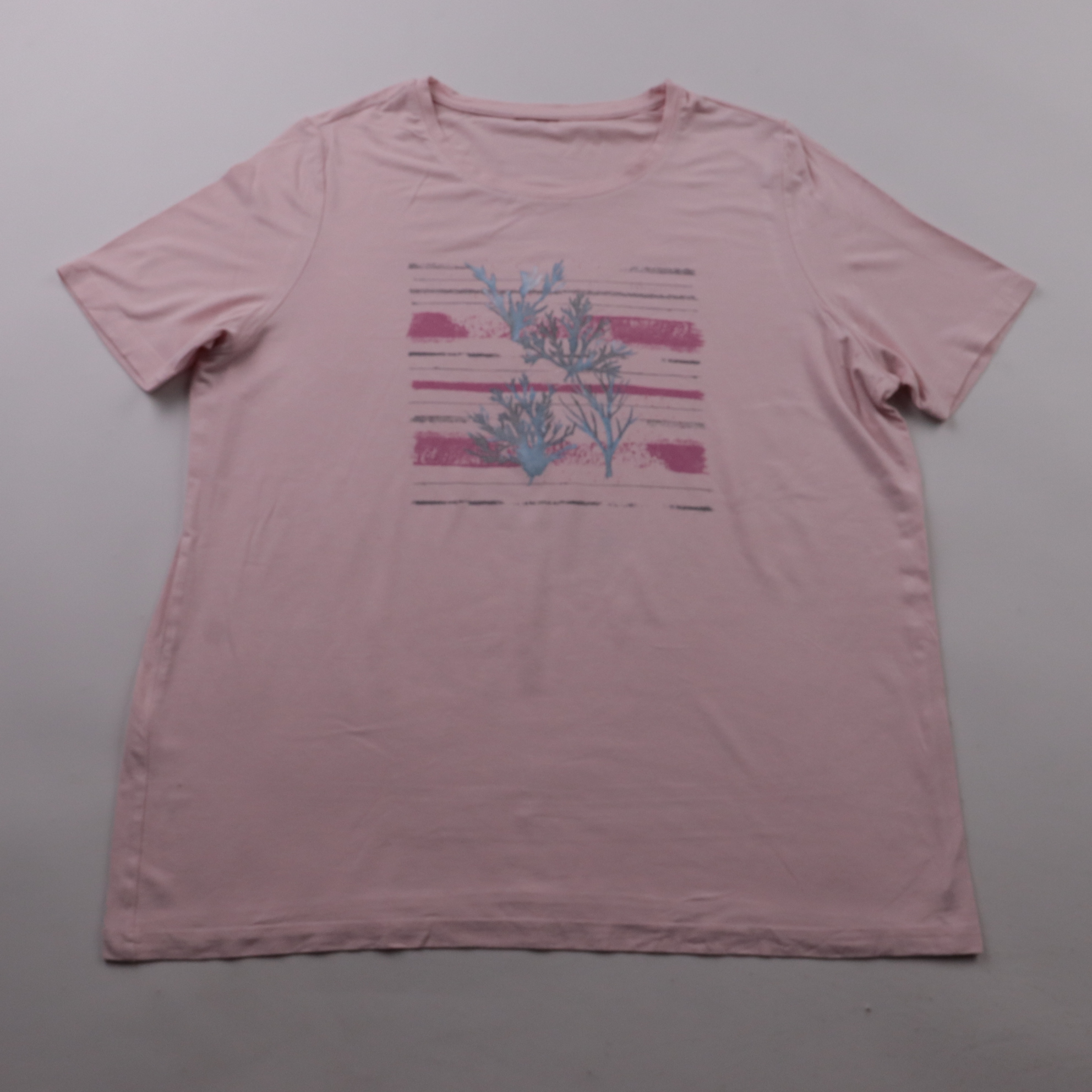 Женская розовая футболка с круглым вырезом и принтом в виде растительных мотивов. Подойдёт для повседневной носки летом и в демисезон под жакет или кардиган. Мягкий трикотаж комфортно сидит и не сковывает движения.