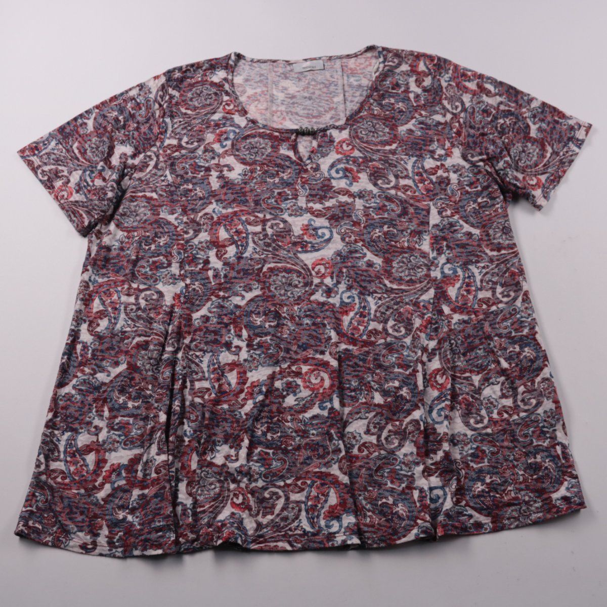 Женская футболка Yessica с коротким рукавом и принтом пейсли в красно-сине-серой гамме. Подойдёт для повседневных образов с джинсами или однотонными брюками в тёплое время года и как слой под кардиган. Трикотаж из вискозы с полиэстером мягкий и не сильно мнётся.