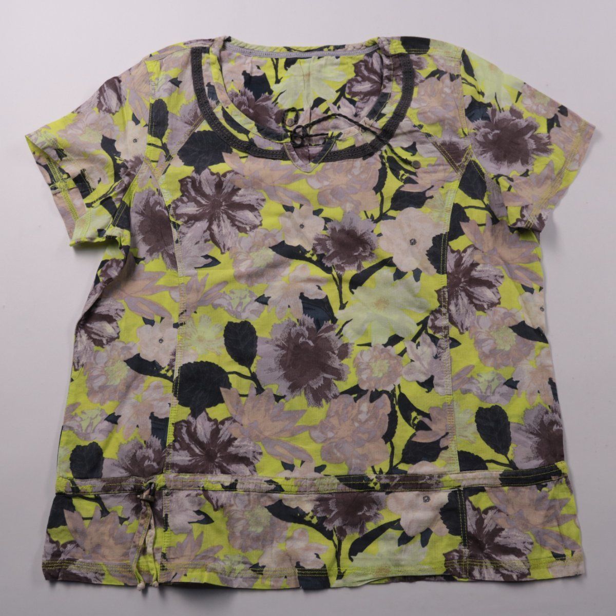 Женская футболка с цветочным принтом в зелёно-серо-фиолетовой гамме и декоративными прострочками. Подойдёт для повседневных летних образов, прогулок и поездок. Лёгкая ткань и короткий рукав делают её удобной в носке.
