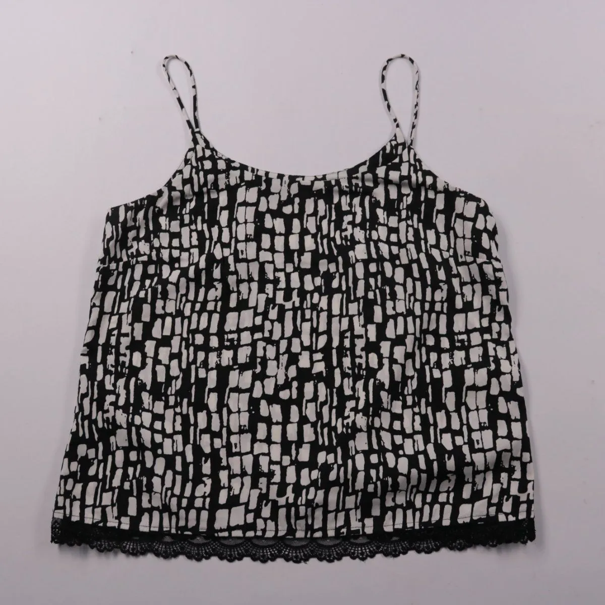 Женский топ ONLY на тонких бретелях с чёрно-белым графичным принтом и кружевной отделкой по низу. Подойдёт для лета и тёплых дней, можно носить как самостоятельный верх или под жакет/кардиган. Лёгкий полиэстер быстро сохнет и почти не мнётся.