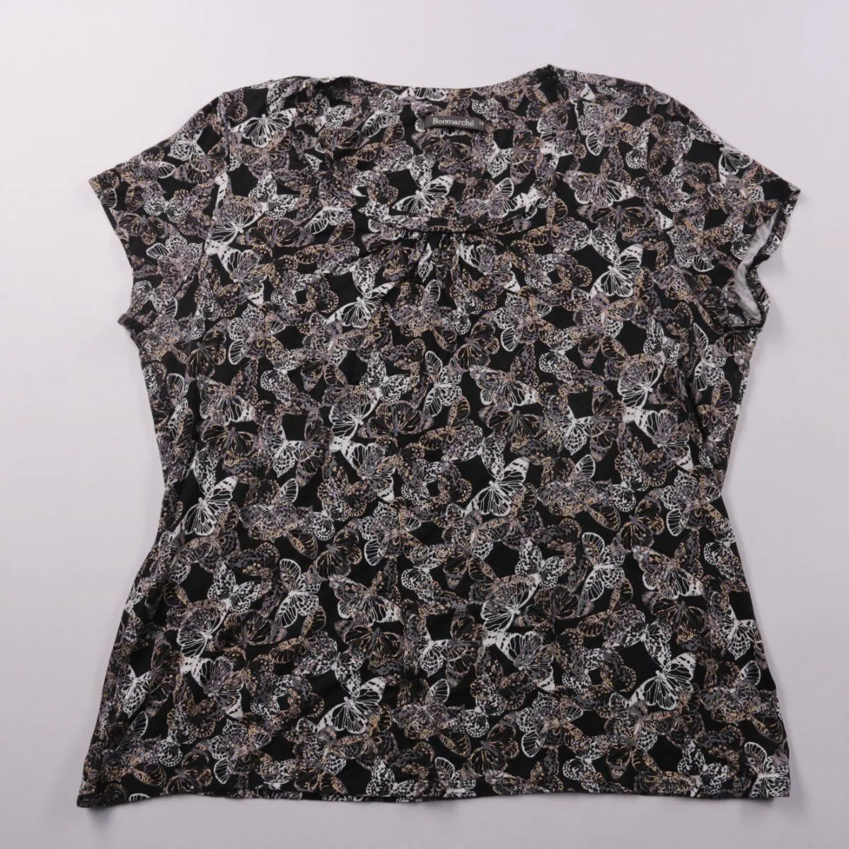 Женский топ Bonmarché с коротким рукавом и драпировкой у выреза, выполнен в чёрном цвете с принтом бабочек. Подойдёт для повседневных образов в тёплую погоду и для офиса с базовым низом. Ткань на основе вискозы с добавлением эластана комфортно тянется и проста в уходе.