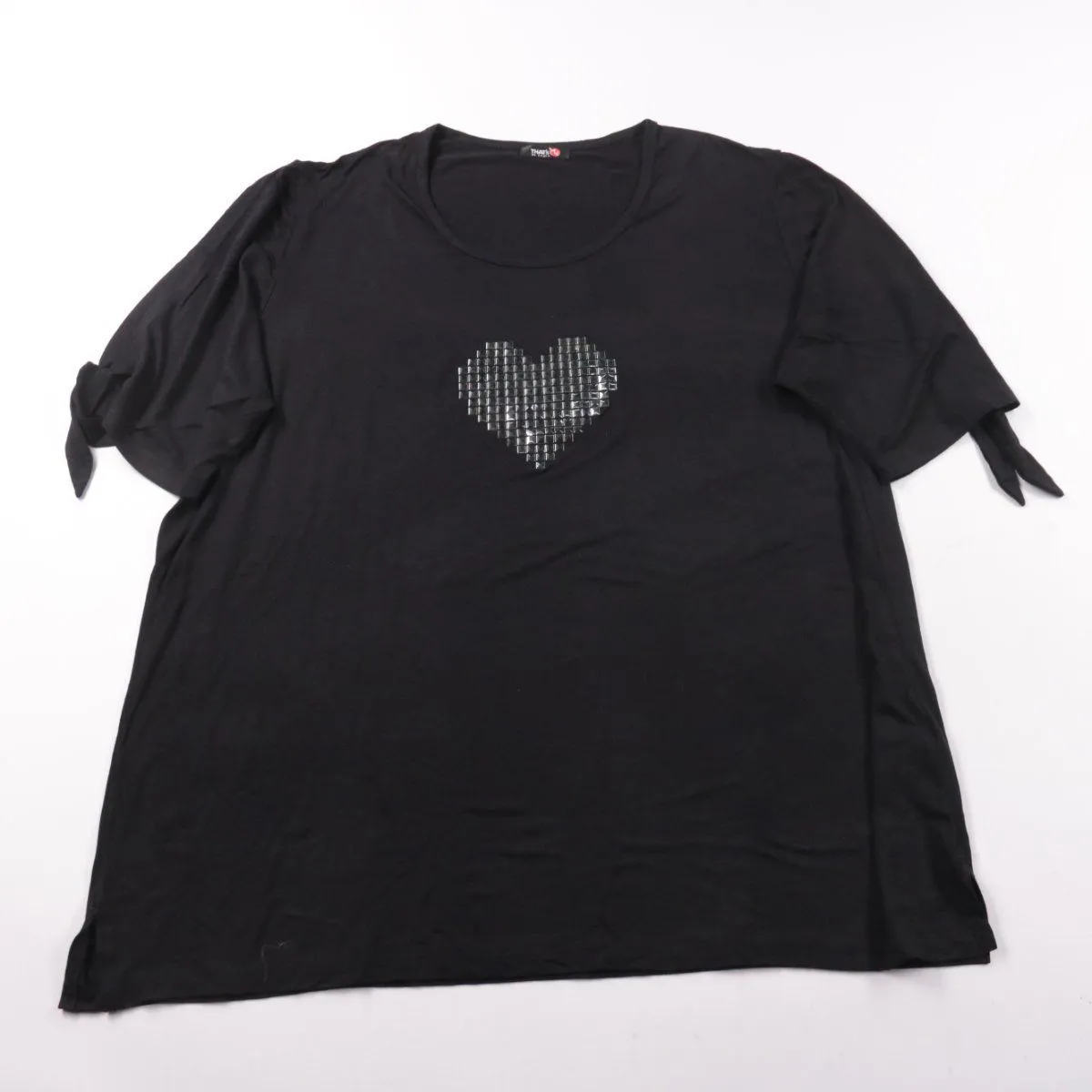Женская футболка THAT'S Me чёрного цвета с декоративным сердцем из пайеток на груди и завязками на рукавах. Подойдёт для повседневных образов и прогулок. Ткань с добавлением эластана немного тянется и комфортно садится по фигуре.
