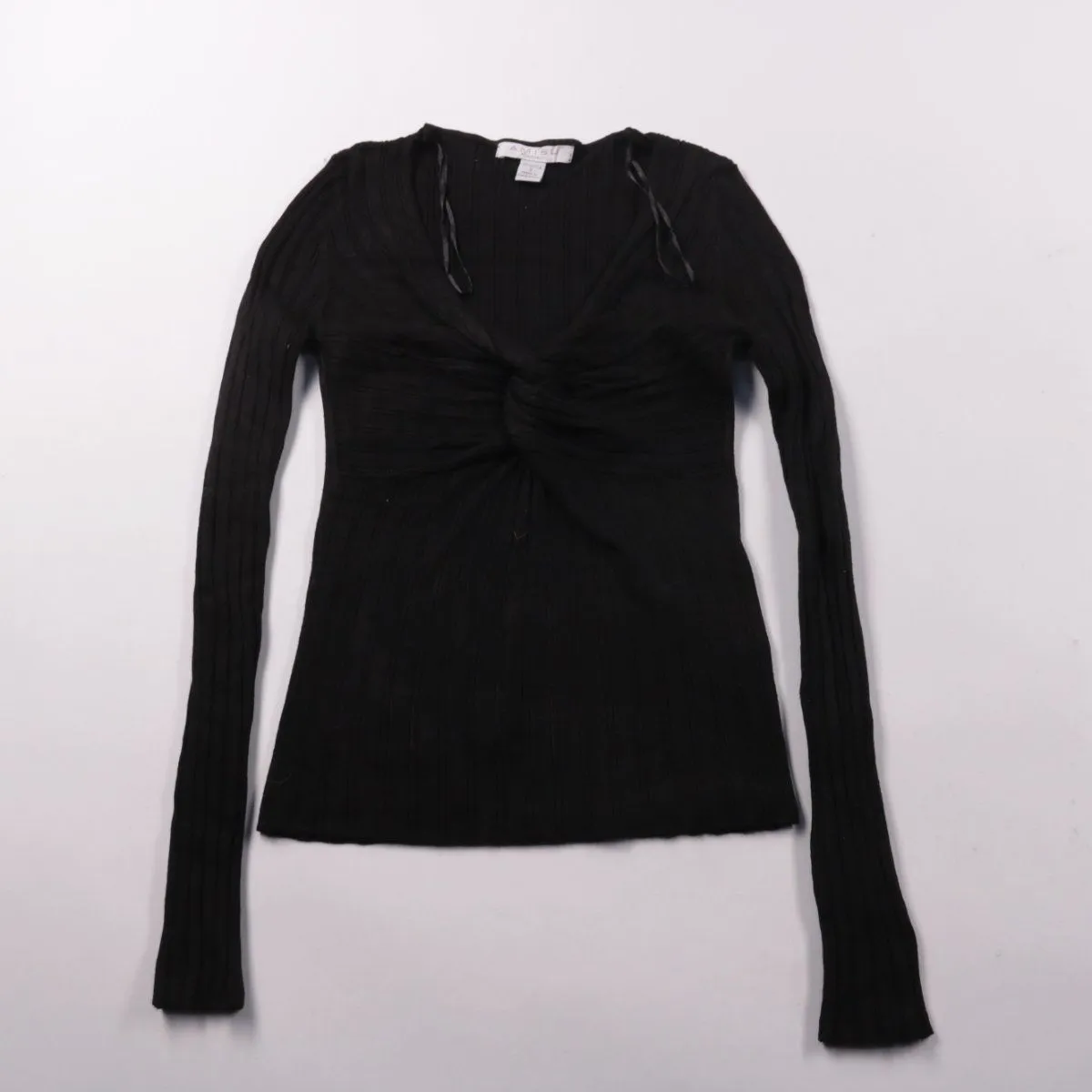 Женский лонгслив Amisu из фактурного ребристого трикотажа в чёрном цвете, с V-образным вырезом и сборкой спереди. Подойдёт для повседневных образов и как базовый слой в прохладную погоду. Эластичная вискозная ткань комфортно тянется и хорошо садится по фигуре.