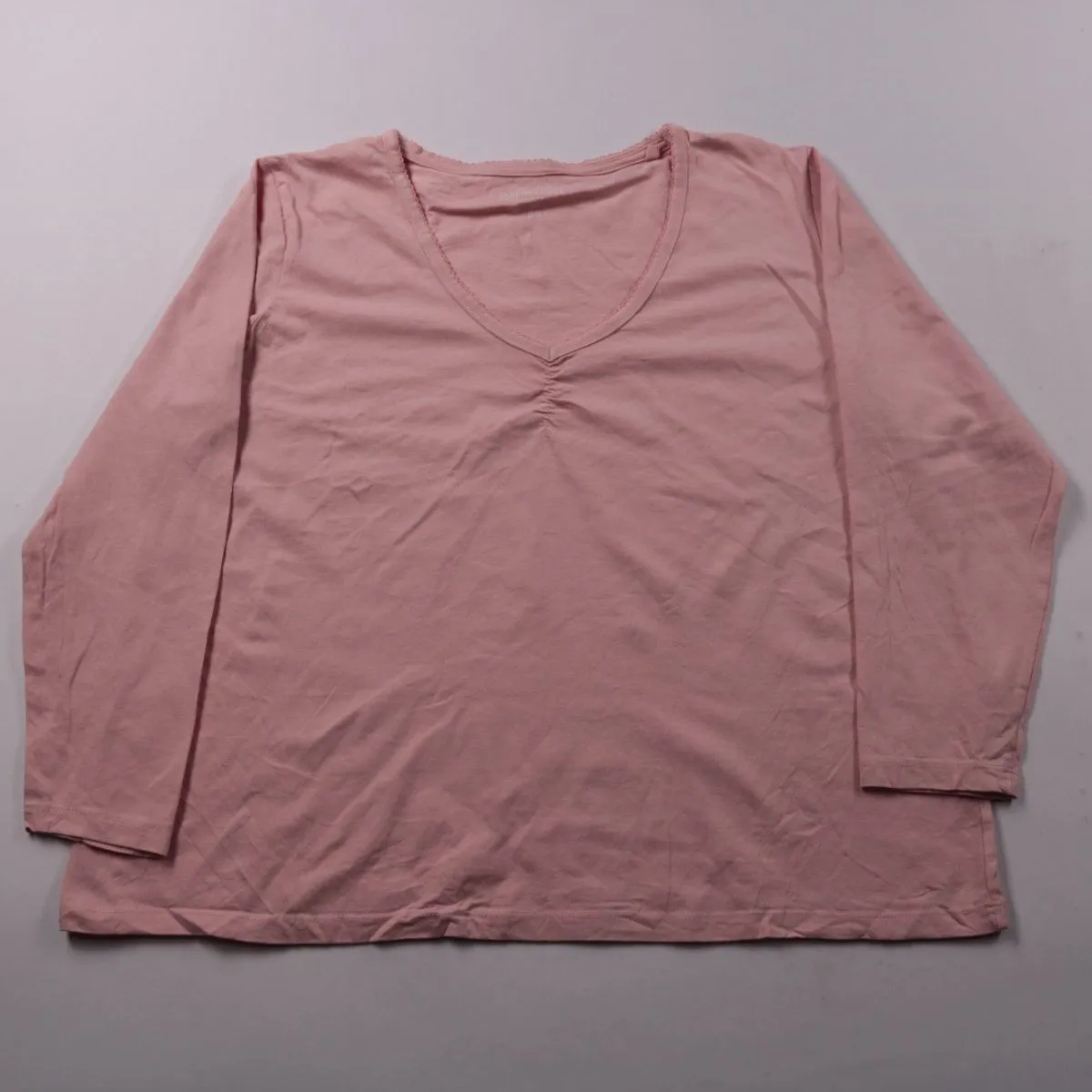 Женский лонгслив Dunnes Stores из мягкого хлопка в нежно-розовом цвете, с V-образным вырезом и небольшой сборкой по центру груди. Подойдёт для повседневной носки и в качестве базового слоя в прохладную погоду. Натуральный материал хорошо пропускает воздух и комфортен к телу.
