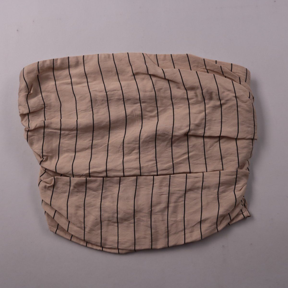 Топ-бандо Gina Tricot в бежевом цвете с тонкой чёрной полоской и эластичной сборкой по корпусу. Подойдёт для летних образов с джинсами, шортами или юбкой и как базовый слой под жакет. За счёт резинки хорошо держится и комфортно садится по фигуре.