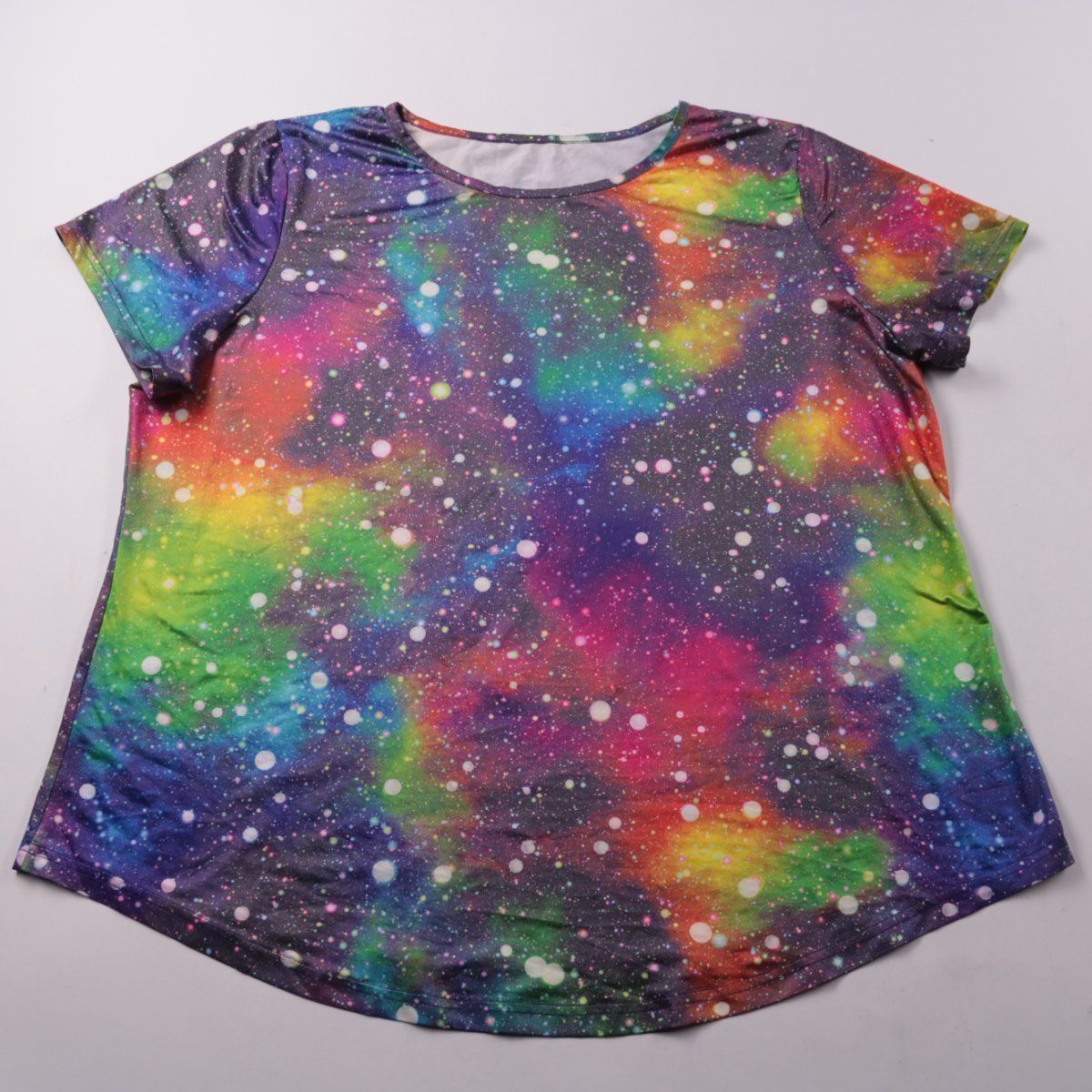 Женская футболка с коротким рукавом и круглым вырезом, бренд не указан. Яркий разноцветный принт в стиле «галактика» подойдёт для повседневных образов и отдыха. Ткань тянется за счёт добавления эластана и комфортно садится по фигуре.