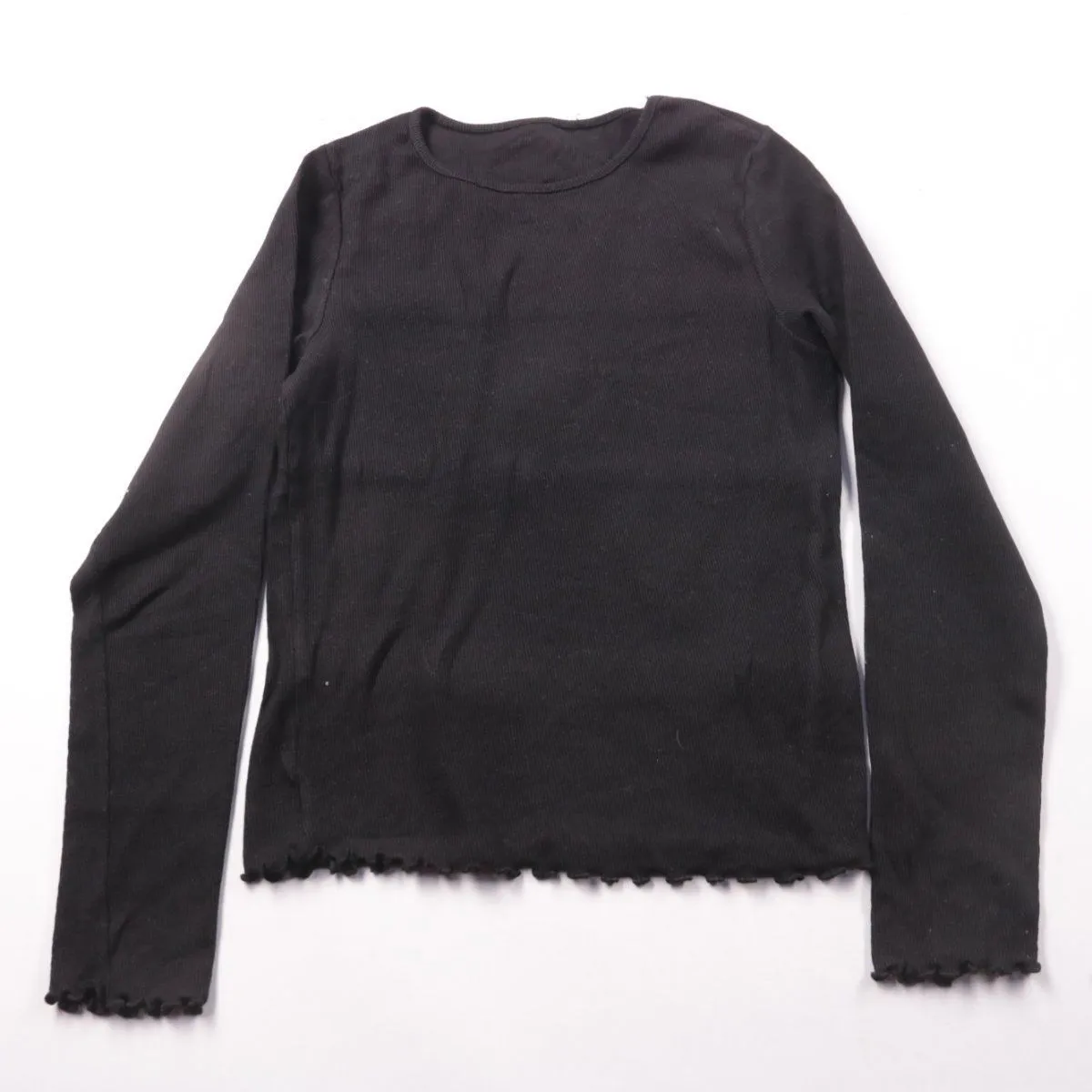 Женский чёрный лонгслив New Look из трикотажа в рубчик с фигурной (волнистой) обработкой низа и манжет. Подойдёт для повседневных образов и как базовый слой в прохладную погоду. Ткань с эластаном слегка тянется и комфортно садится по фигуре.