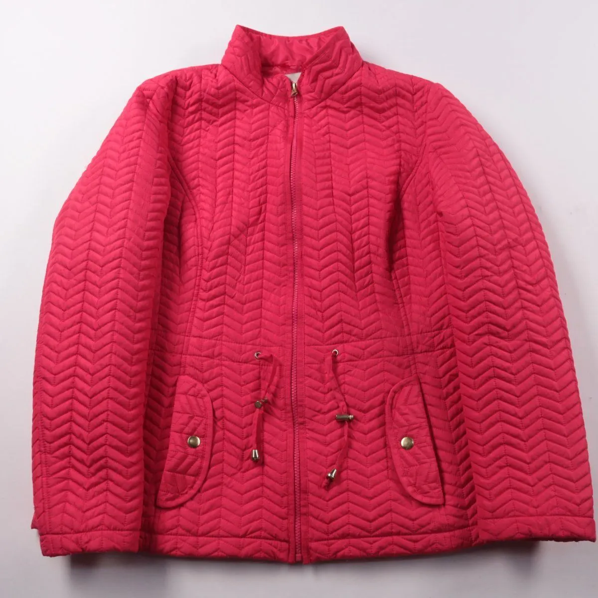 Стёганая демисезонная куртка Tu ярко-розового цвета на молнии, с воротником-стойкой. Есть кулиска на талии и накладные карманы на кнопках — удобно регулировать посадку и носить в прохладную весну/осень.