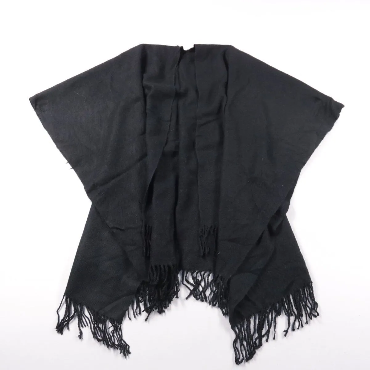 Чёрный шарф с бахромой, без видимого бренда. Подойдёт для повседневных образов и как аккуратный акцент к пальто или куртке в прохладную погоду. Легко складывается и удобно носить с собой.