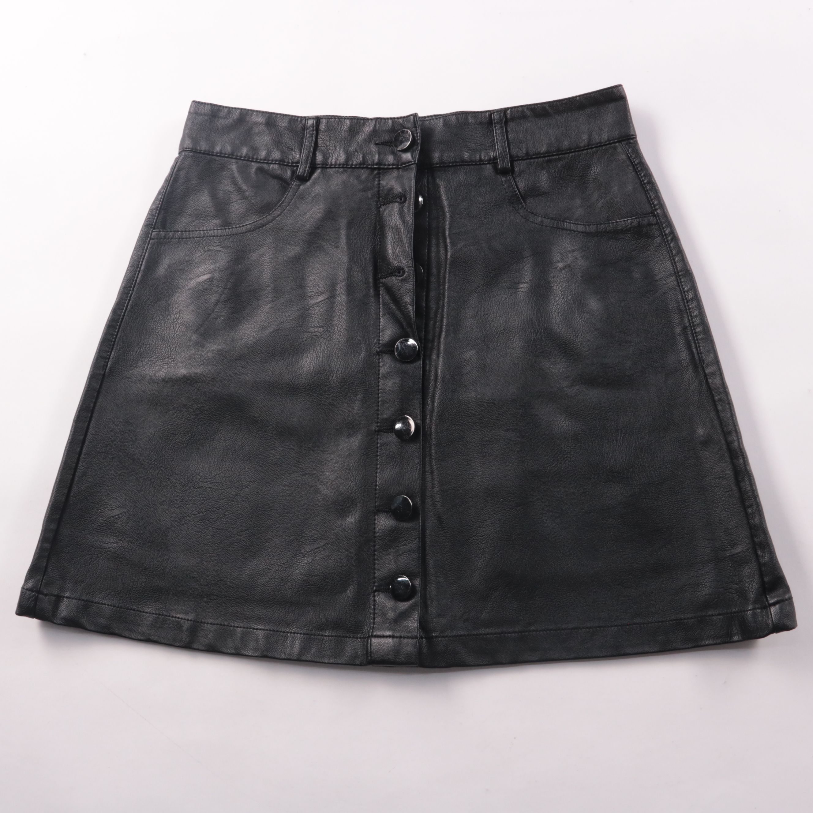 Юбка Denim Club из экокожи чёрного цвета на кнопках спереди, с карманами и шлёвками под ремень. Подойдёт для повседневных образов и выхода в город в любое время года. Материал практичный — достаточно протереть влажной тканью.