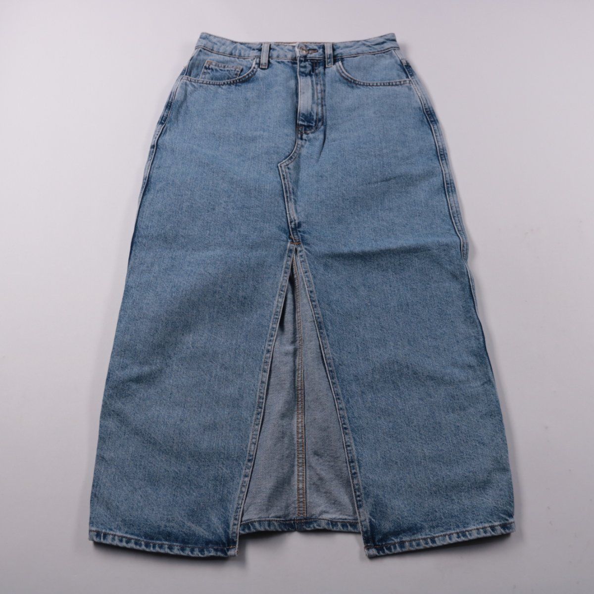 Джинсовая юбка Mango голубого цвета миди/макси с высокой посадкой и разрезом спереди. Подойдёт для повседневных образов в городе и на работу с футболкой, рубашкой или свитером. Плотный деним хорошо держит форму и легко сочетается с любой обувью.